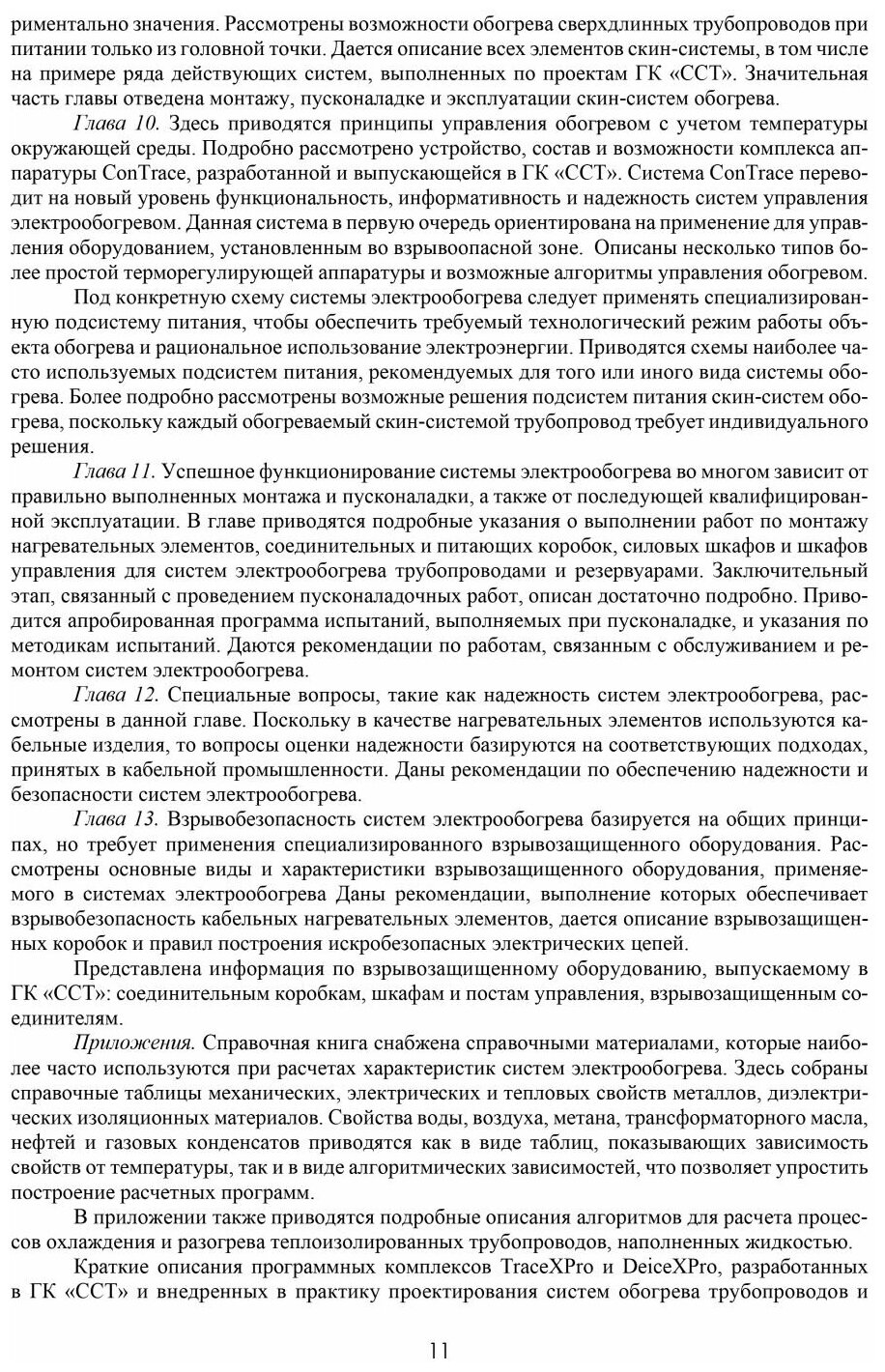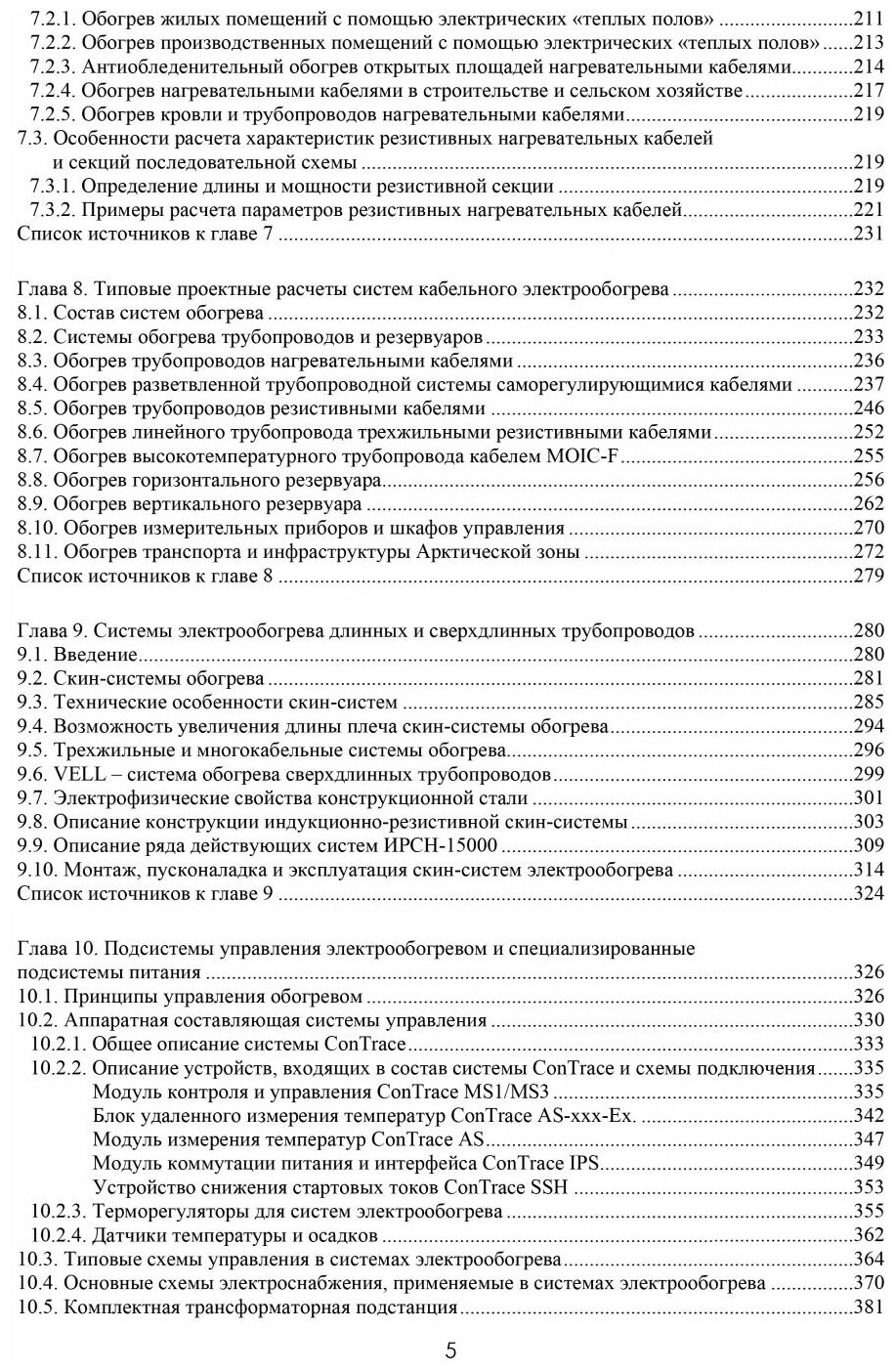 Рассмотрены этапы становления и состояние систем распределенного электрообогрева в России; методы тепловых и электрических расчетов и основ проектирования систем электрообогрева. Излагаются основы классификации и терминология нагревательных кабелей и изделий из них. Рассмотрены основные характеристики и отличительные особенности саморегулирующихся кабелей и лент. Показаны конструктивные решения, обеспечивающие безопасность эксплуатации резистивных нагревательных кабелей. Подробно рассмотрено устройство, состав и возможности комплекса контрольно-управляющей аппаратуры ConTrace. Показаны особенности взрывозащищенной аппаратуры для систем электрообогрева. Дается описание взрывозащищенной аппаратуры, производимой в ГК "ССТ". Приводятся подробные указания о выполнении работ по монтажу нагревательных элементов, соединительных и питающих коробок, силовых шкафов и шкафов управления для систем электрообогрева трубопроводов и резервуаров.