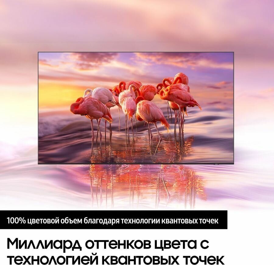Миллиард цветовых оттенков с технологией квантовых точек Технология квантовых точек позволяет добиться непревзойденного качества изображения. Благодаря инновационной технологии, в основе которой лежит процесс превращения света в цвет, телевизор передает 100% цветового объема и обеспечивает реалистичность изображения при любом уровне яркости.Более широкий диапазон контрастности для кинематографического масштаба Технология Quantum HDR подчеркивает детали и контрасты, чтобы вы прочувствовали всю мощь каждого изображения. Превосходя ведущие стандарты, динамическое отображение тонов HDR10+ делает темные цвета насыщеннее, добавляет изображениям эффектности и повышает видимость деталей.Более тонкий и изящный, чем когда-либо Такого вы еще не видели: потрясающе тонкий профиль вашего телевизора просто безупречно сливается со стеной.Весь любимый контент доступен в одном месте На обновленной платформе Smart Hub организован тщательный подбор контента, чтобы вы тратили меньше времени на поиски и больше — на просмотр фильмов, передач и другого контента, который вам нравится.