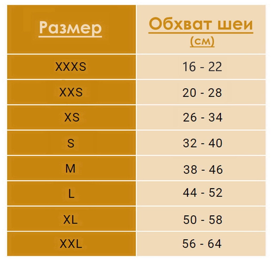 Размеры в сантиметрах: XXS (20-28 см), XS (26-34 см), S (32-40 см), M (38-46 см), L (44-52 cм), XL (50-58 см)