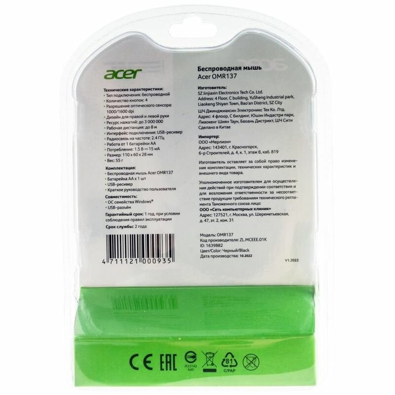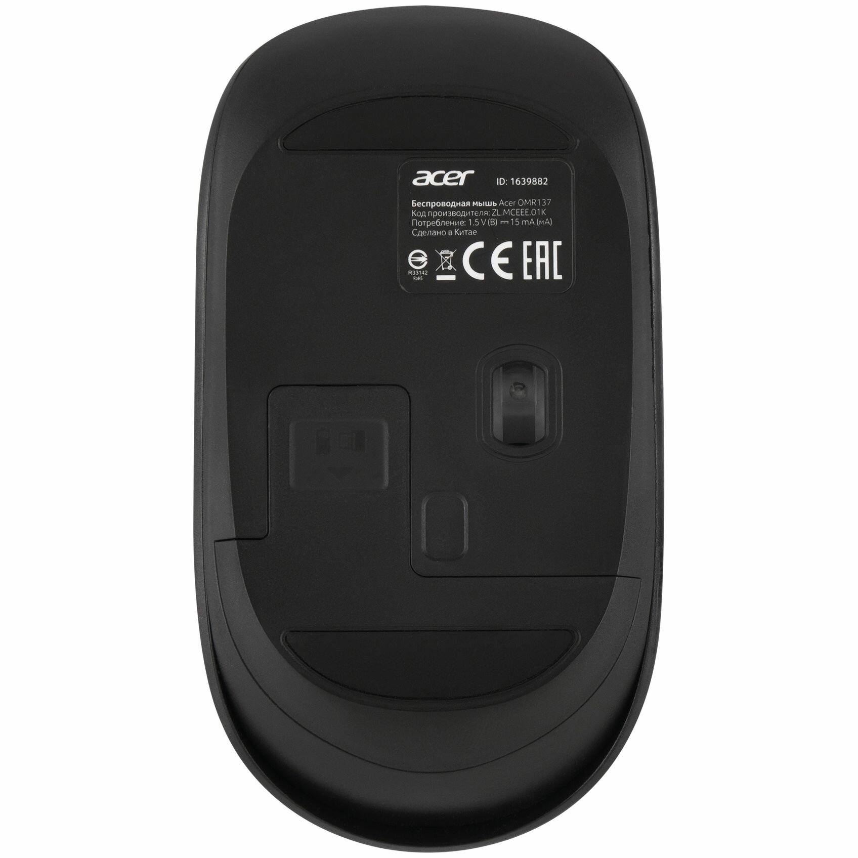 Мышь Acer OMR137 черный, оптическая, разрешение сенсора 1600dpi, беспроводная, кнопок: 3, подходит для правой и левой руки (ZL.MCEEE.01K)