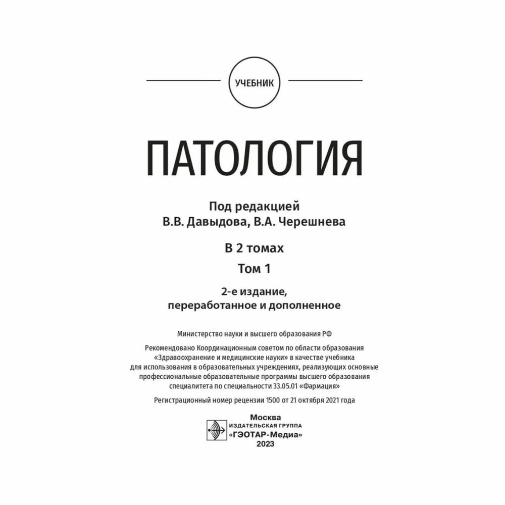 Патология В 2 томах Том 1 учебник (Давыдов Виктор Виктрорович, Бяловский Юрий Юльевич, Черешнев Валерий Александрович); ГЭОТАР-Медиа, 2023