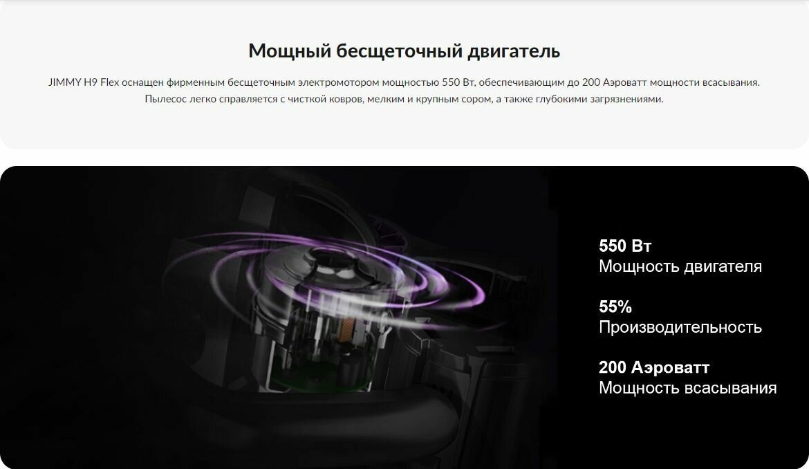 Аккумуляторный вертикальный пылесос JIMMY H9 FLEX использует высокоэффективный бесщеточный двигатель с цифровым управлением мощностью 600 Вт собственной разработки, который обеспечивает мощность всасывания 200 Вт, более быстро и тщательно очищает волосы на ковре, крупный и мелкий мусор, а также пыль в щелях пола. Важным преимуществом пылесоса является умный датчик пыли, который позволяет менять мощность в зависимости от загрязнения поверхности.