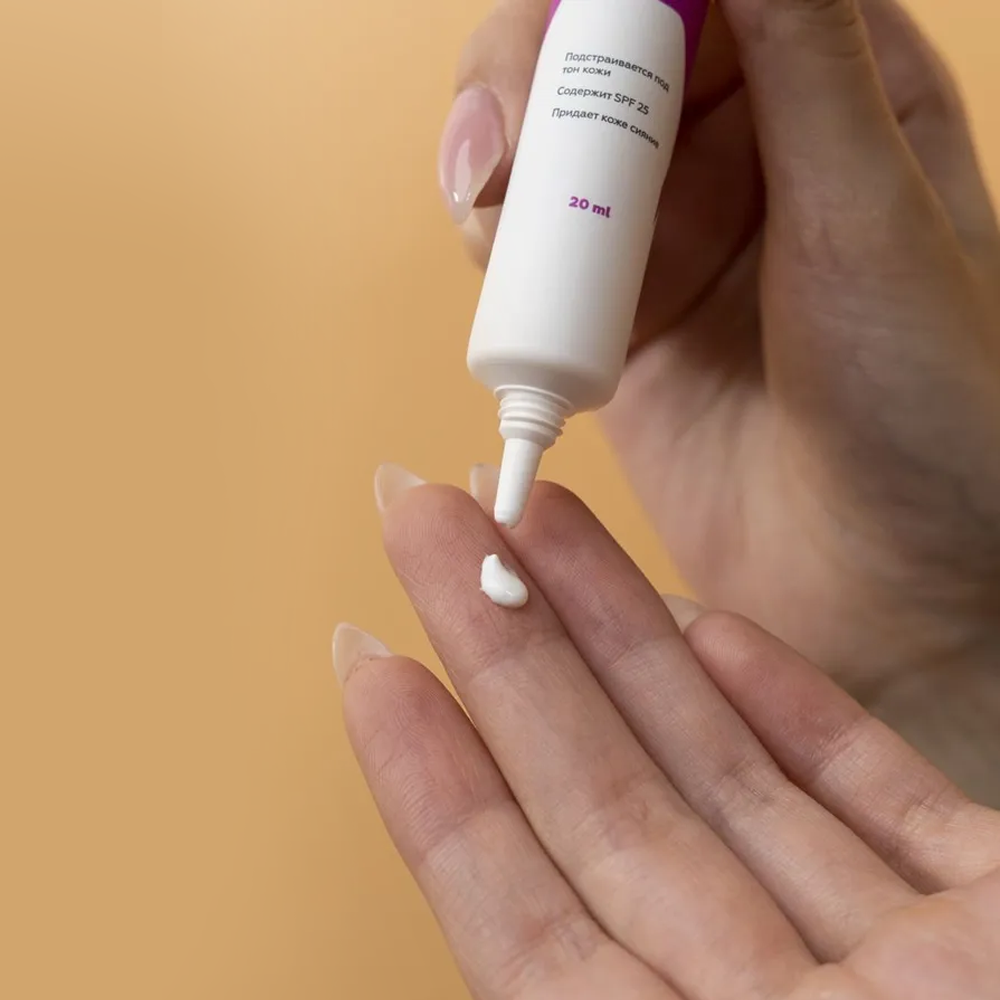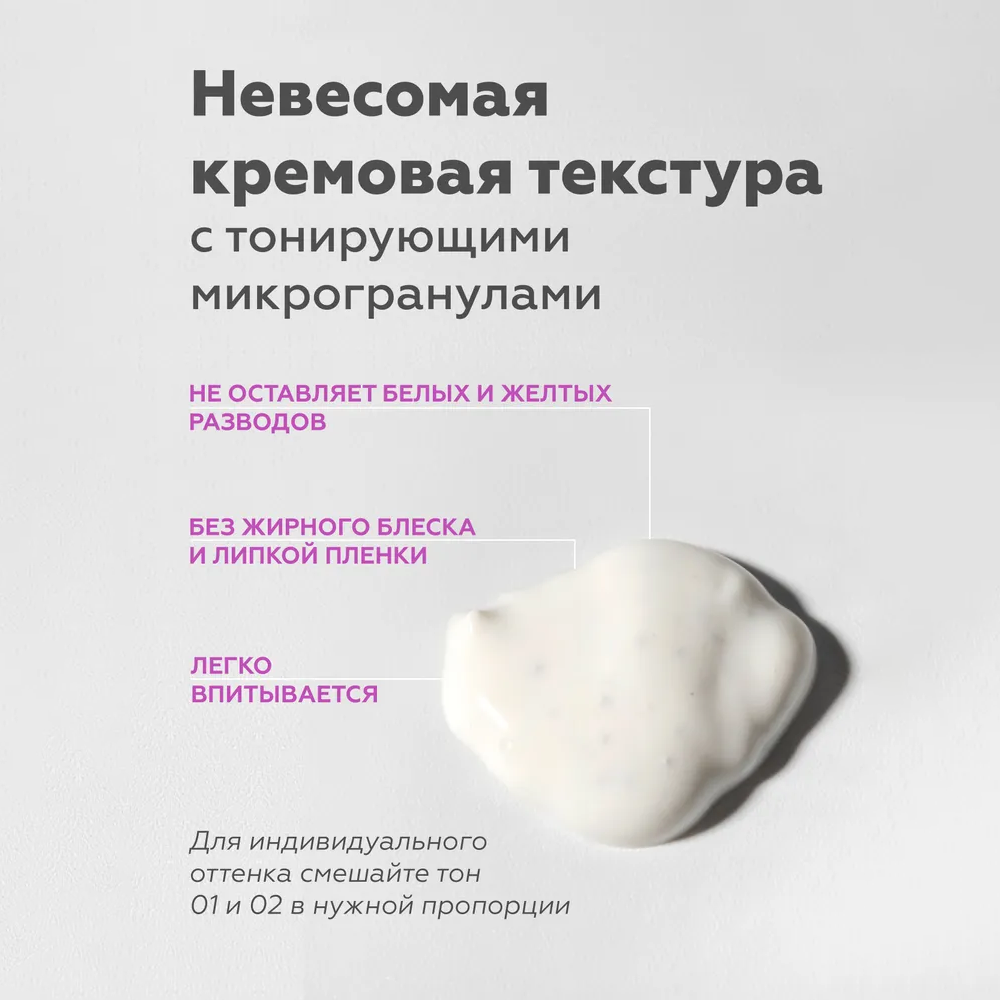 Крем имеет невесомую текстуру, подстраивается под цвет кожи, легко впитывается, не оставляя белых разводов, жирного блеска и липкой пленки.