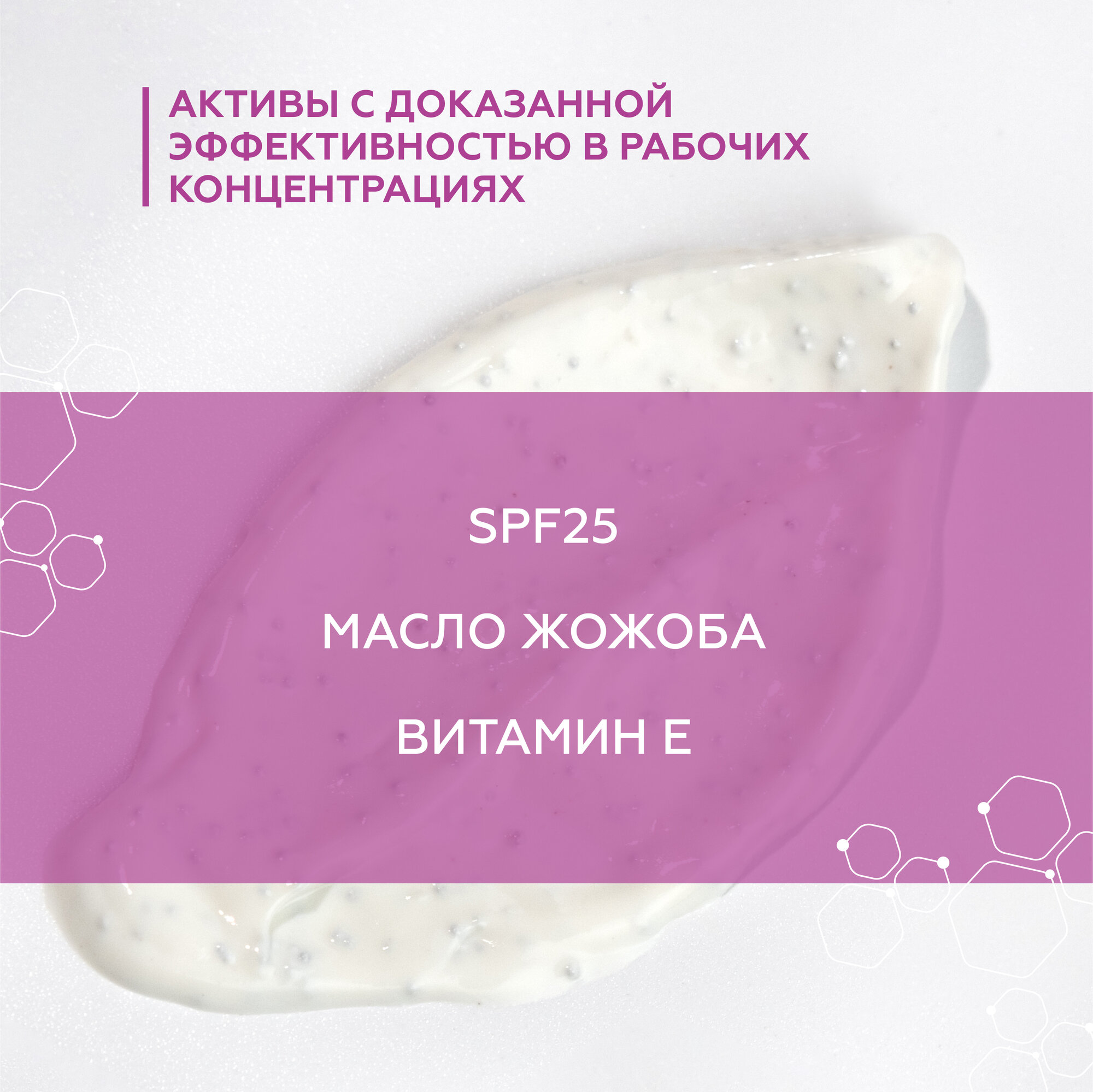 Защищает от всех видов солнечного излучения: UVA, UVB, HEV и IR. Содержит два вида УФ-фильтров: физические в наноформе и инновационные химические, которые предотвращают фотостарение и повреждение ДНК клеток. SPF25.