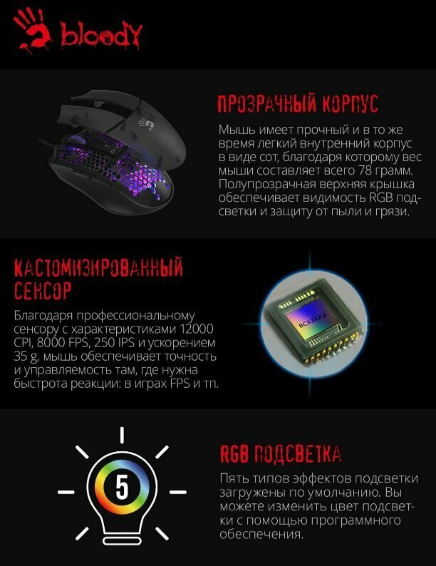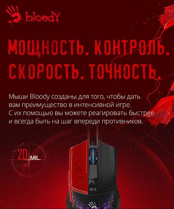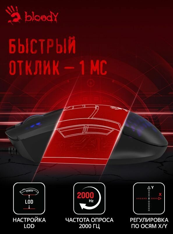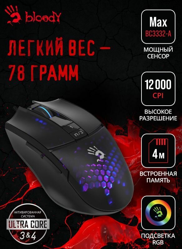 | Особенности | Игровой сенсор Max BC3332-A, активирована система Bloody Core 3,4 |