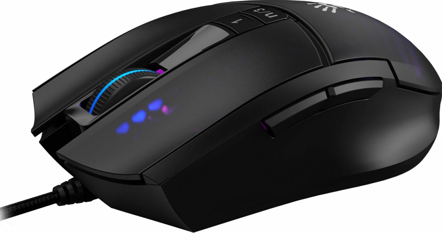 Классическая проводная мышь с удобным размером 72 x 39 x 125 мм. Корпус пластиковый в черном цвете. Есть интересный дизайн в виде пчелиных сот, через которые просвечивается RGB подсветка, мышь выглядит стильно и необычно. Оптический сенсор с разрешением 12000 dpi реагирует даже на небольшое движение руки. Мышь одинаково хорошо работает на разных поверхностях и коврик ей необязательно.