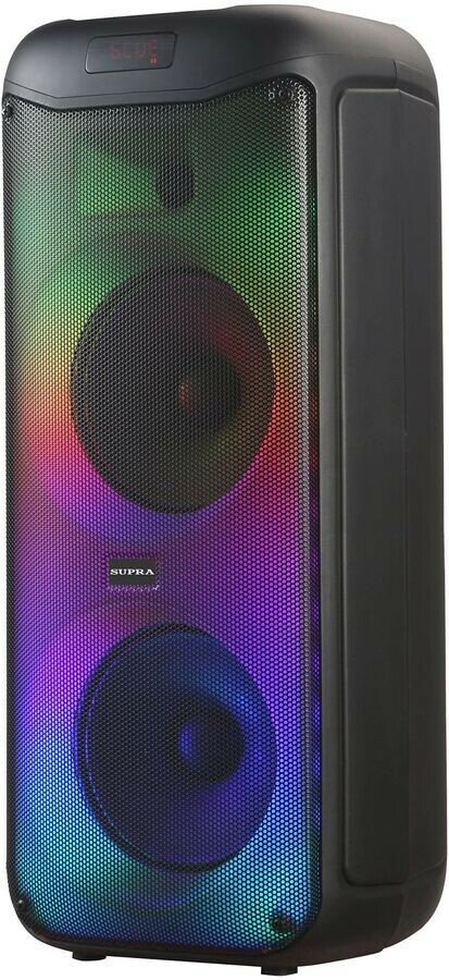 Портативная аудиосистема с различными способами воспроизведения музыки, караоке, подсветкой и пультом управления в комплекте.