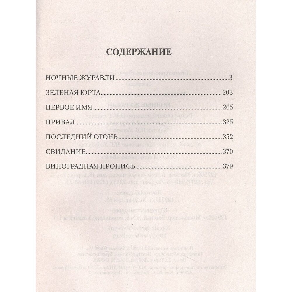 В книгу известного сибирского писателя Александра Пешкова вошли роман "Ночные журавли"", повести "Зеленая юрта" и "Первое имя", а также рассказы "Привал", "Последний огонь", "Свидание", "Виноградная пропись". Все произведения посвящены алтайской деревне. В романе-воспоминании "Ночные журавли" лирический герой с высоты прожитых лет отчетливо видит собственную жизнь, тесно переплетенную с судьбами других людей, которые раскрываются по мере повествования, сочетая трагическое с комическим, героическое с повседневным, тайное с явным.