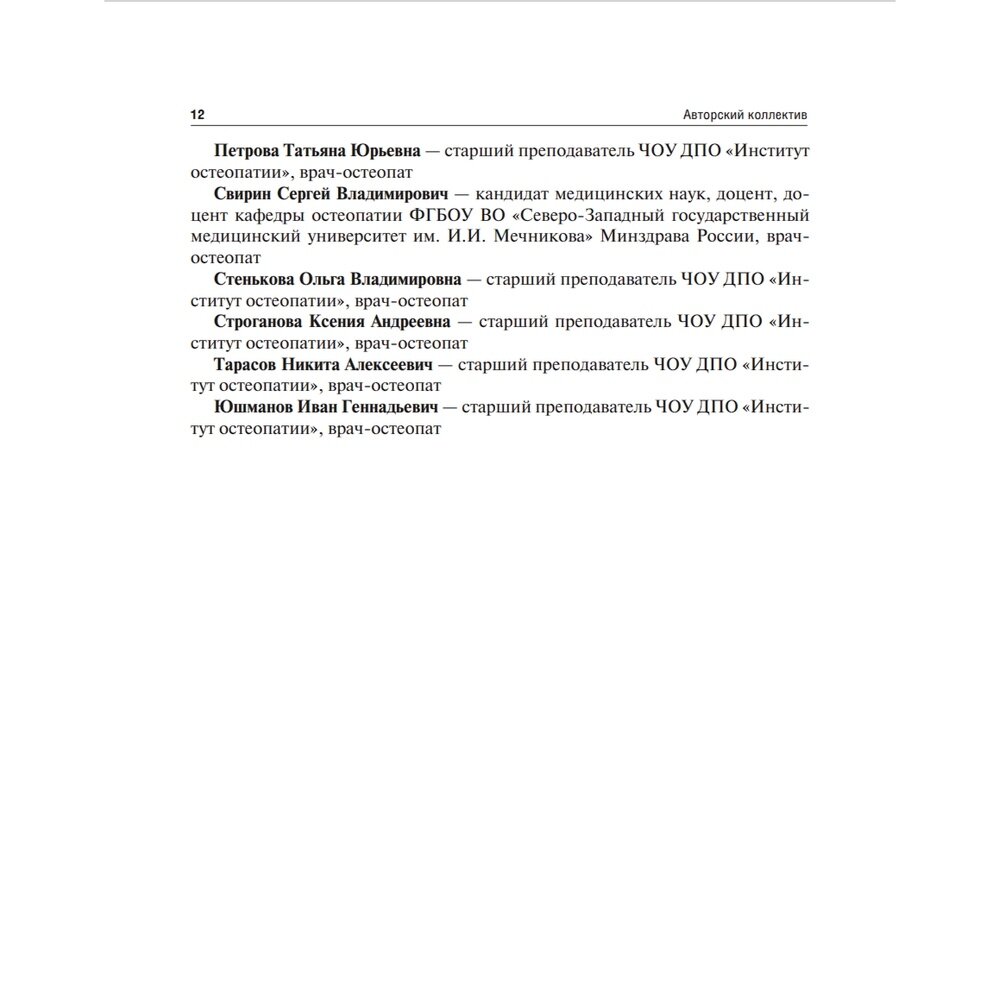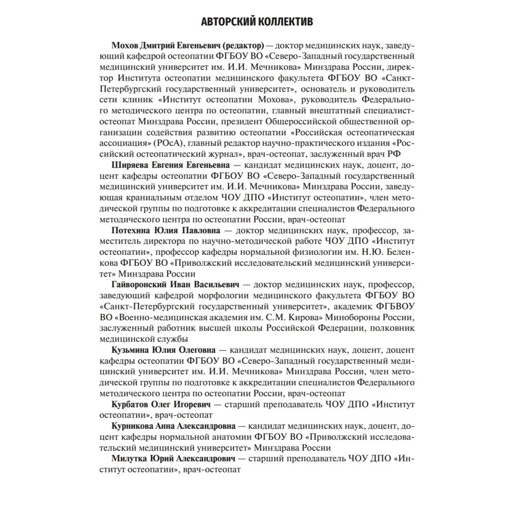Учебник предназначен студентам и ординаторам медицинских вузов, обучающимся по специальности "Остеопатия", а также может быть использован в системе дополнительного профессионального образования для слушателей программы профессиональной переподготовки и программ повышения квалификации врачей по специальности "Остеопатия".