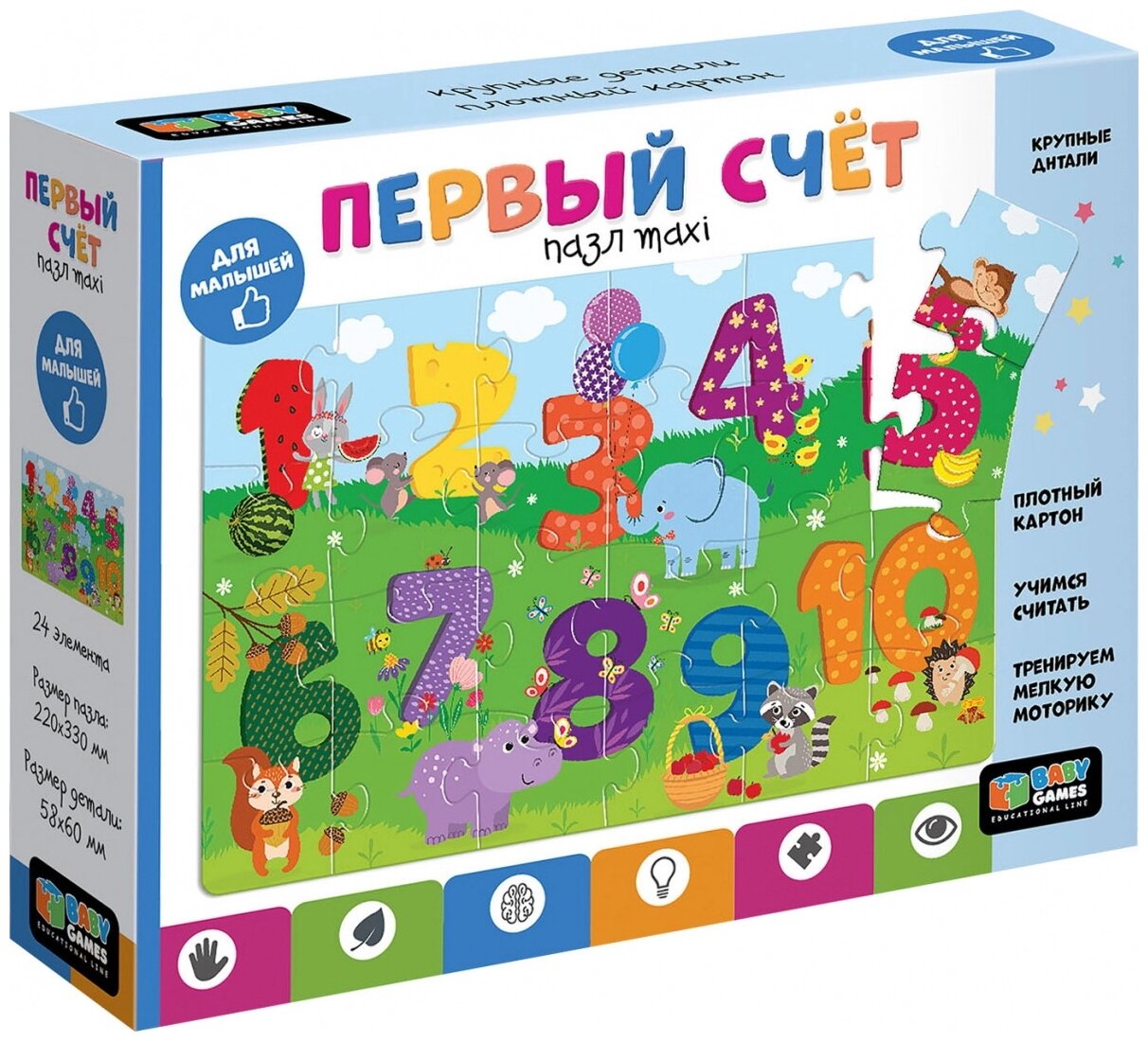 Пазл 24 элемента - это отличный подарок для любого ребенка! Сборка пазла поможет развить внимательность и мелкую моторику, а также легко и просто научиться считать до десяти! Крупные детали из толстого картона удобно ложатся в маленькие ручки. Учитесь считать вместе с Baby Games.