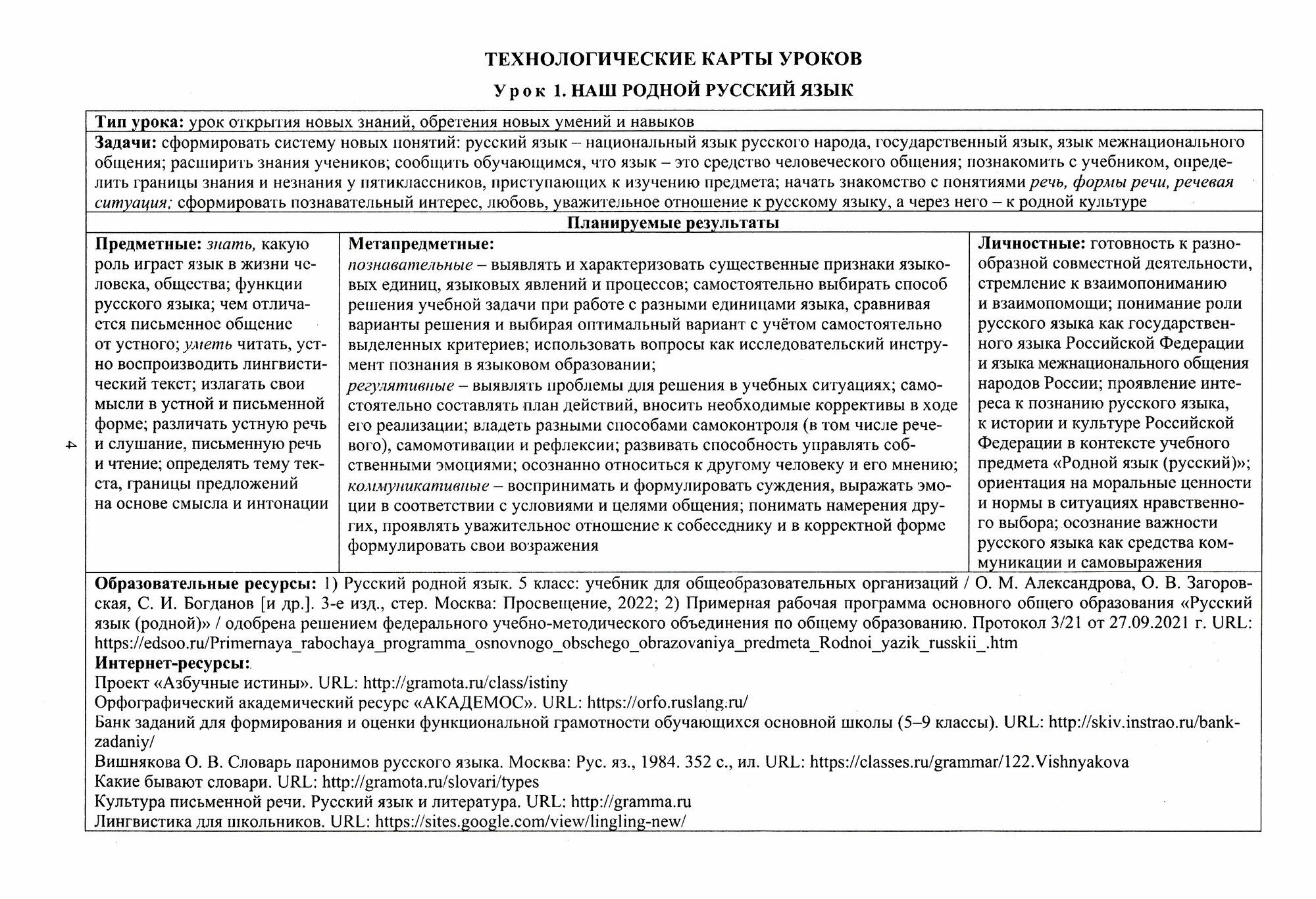 Технологические карты уроков отражают структуру урока, формы и виды деятельности учителя и обучающихся, планируемые результаты в области личностных, метапредметных и предметных универсальных учебных действий с учетом планируемых результатов основного общего образования; приемы рефлексивной деятельности.