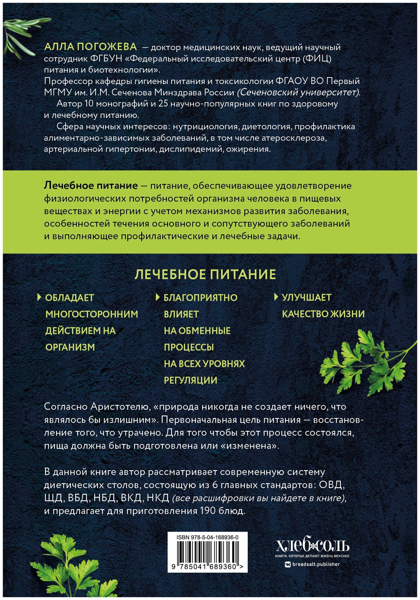 Профессор кафедры гигиены питания и токсикологии ВПО Первый МГМУ им. И.М.Сеченова (Сеченовский университет). Автор 10 монографий и 25 научно-популярных книг по здоровому и лечебному питанию. Она принимает участие в российских и международных форумах и конференциях, и ее экспертное мнение очень важно в таких книгах, как эта. Ценностью данной книги являются те 190 рецептов, которые рекомендованы НИИ питания, и блюда, по которым готовят в лечебных учреждениях по всей стране. Теперь вы сможете использовать эти рецепты у себя дома при лечении некоторых болезней и для их профилактики.