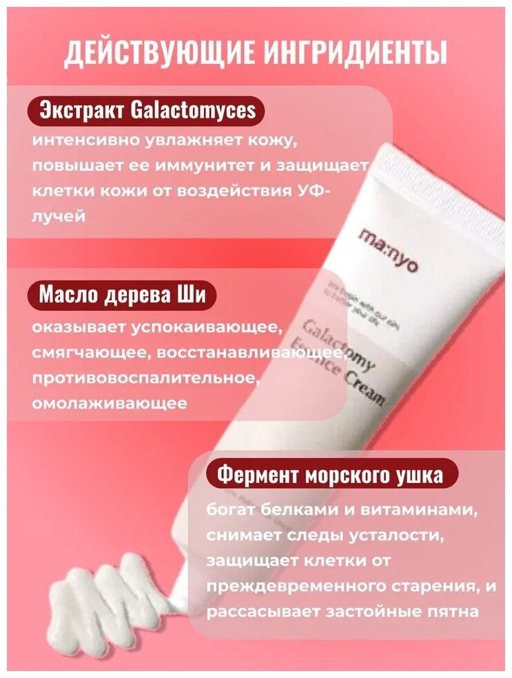 Галактомисис (экстракт дрожжевых грибков): Увлажняет и разглаживает кожу, стимулирует синтез коллагена и процесс регенерации.