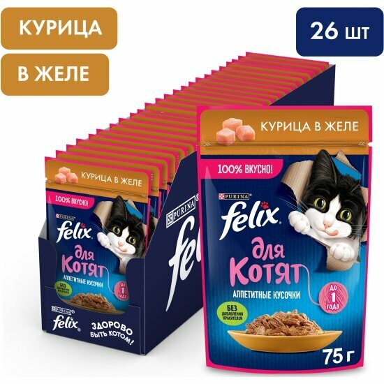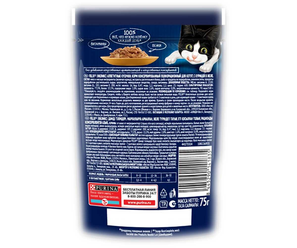 Курица в желе от производителя Феликс для котят - отличное питание! Сколько не покупала - все ок как со здоровьем, так и и с перевариваемостью. Котенку в радость кушать небольшие ломтики мяса, все съест, до блеска. На день требуется буквально несколько пакетиков корма и животное сытое! Своих денег стоит,могу рекомендовать к покупке!
