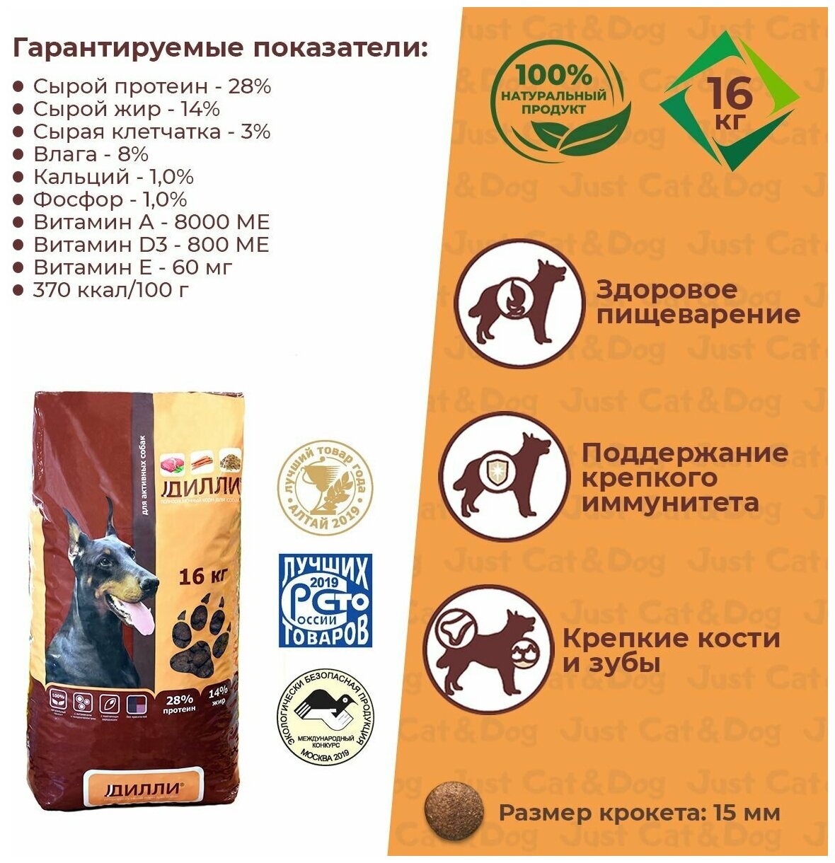 Полнорационный корм для взрослых активных собак, испытывающих повышенную физическую нагрузку, для охотничьих собак и участвующих в выставках. — Для красивой шерсти и здоровой кожи — Поддержание крепкой иммунной системы — Поддержание прекрасной физической формы.Корма Дилли изготавливаются в экологически чистом Алтайском крае на базе крупнейшего агропромышленного комплекса Алейскзернопродукт, из сырья местных производителей, на оборудовании ведущих мировых фирм — Wenger, Cusinato, Ricciarelli, Effytec. Сырье и готовые корма проходят тщательную проверку в собственной аккредитованной лаборатории. Корма сбалансированы с учетом рекомендаций FEDIAF (европейской ассоциации производителей кормов). Качество кормов Дилли подтверждено наградами – 100 лучших товаров России, медалью «Экологически безопасная продукция» и дипломом «Лучший Алтайский товар».