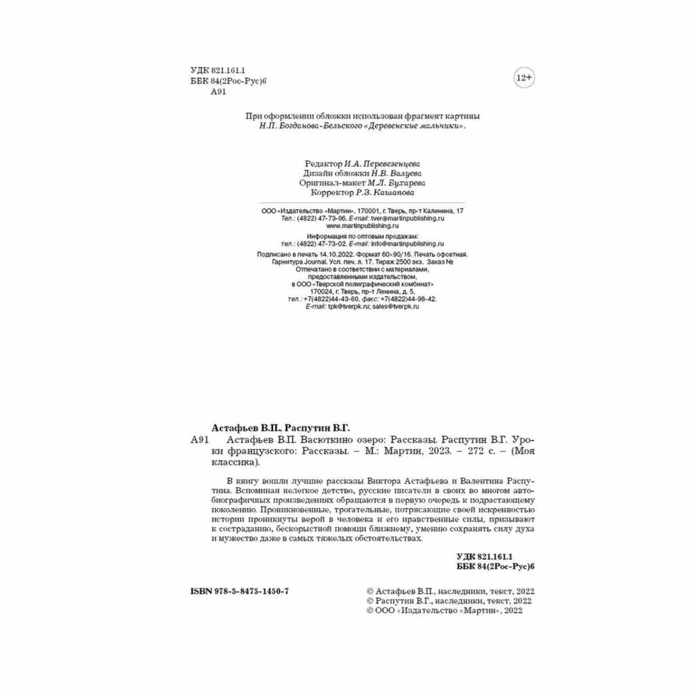 Сервис сравнения цен СкидкаГИД предлагает сравнить цены на товар «Книга: Васюткино озеро. Уроки французского (Астафьев Виктор Петрович; Распутин Валентин Григорьевич); Мартин, 2023»