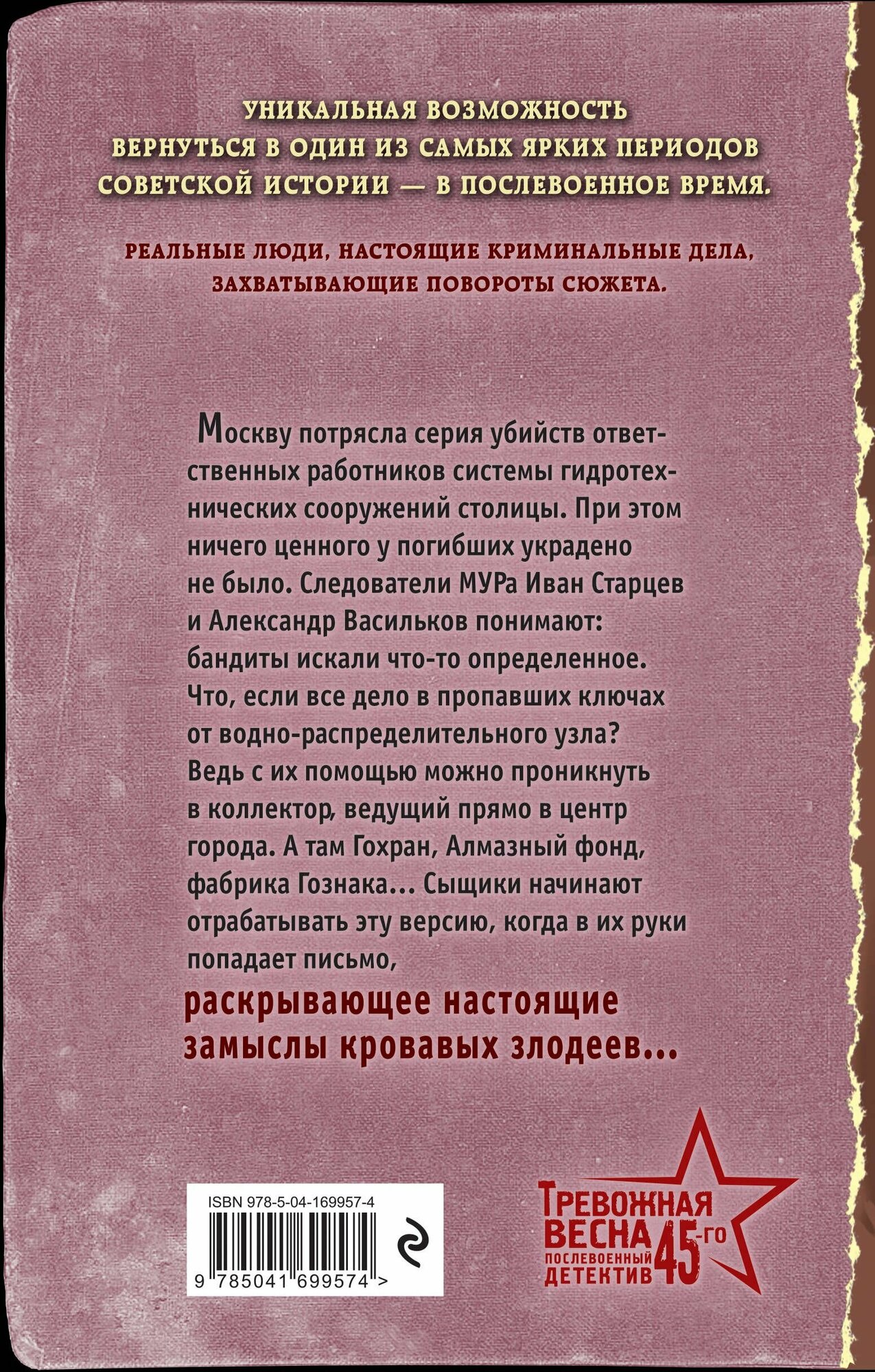 Москву потрясла серия убийств ответственных работников системы гидротехнических сооружений столицы. При этом ничего ценного у погибших украдено не было. Следователи МУРа Иван Старцев и Александр Васильков понимают: бандиты искали что-то определенное. Что, если все дело в пропавших ключах от водно-распределительного узла? Ведь с их помощью можно проникнуть в коллектор, ведущий прямо в центр города. А там Гохран, Алмазный фонд, фабрика Гознака… Сыщики начинают отрабатывать эту версию, когда в их руки попадает письмо, раскрывающее настоящие замыслы кровавых злодеев…