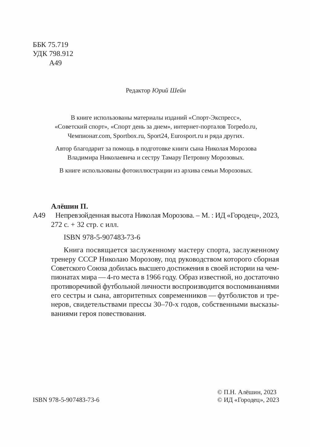 Книга посвящается заслуженному мастеру спорта, заслуженному тренеру СССР Николаю Морозову, под руководством которого сборная Советского Союза добилась высшего достижения в своей истории на чемпионатах мира — 4?го места в 1966 году.