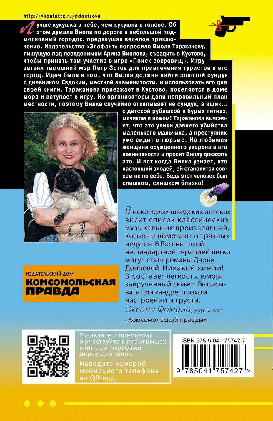 Лучше кукушка в небе, чем кукушка в голове. Об этом думала Виола по дороге в небольшой подмосковный городок, предвкушая веселое приключение. Издательство "Элефант" попросило Виолу Тараканову, пишущую под псевдонимом Арина Виолова, съездить в Кустово, чтобы принять там участие в игре "Поиск сокровищ". Игру затеял тамошний мэр Петр Зотов для привлечения туристов в его город. Идея была в том, что Вилка должна найти золотой сундук с дневником Евдокии, местной знаменитости, и использовать его для своей книги. Тараканова приезжает в Кустово, поселяется в доме мэра и вступает в игру. Но организаторы дали неправильный план местности, поэтому Вилка случайно откапывает не сундук, а ящик… с детской рубашкой в бурых пятнах, мячиком и ножом! Тараканова выясняет, что это - улики давнего убийства маленького мальчика, а преступник уже сидит в тюрьме. Но любимая женщина осужденного уверена в его невиновности и просит Виолу доказать это. И вот когда Вилка узнает, кто настоящий злодей, ей становится совсем не по себе. Ведь этот человек был слишком, слишком близко!