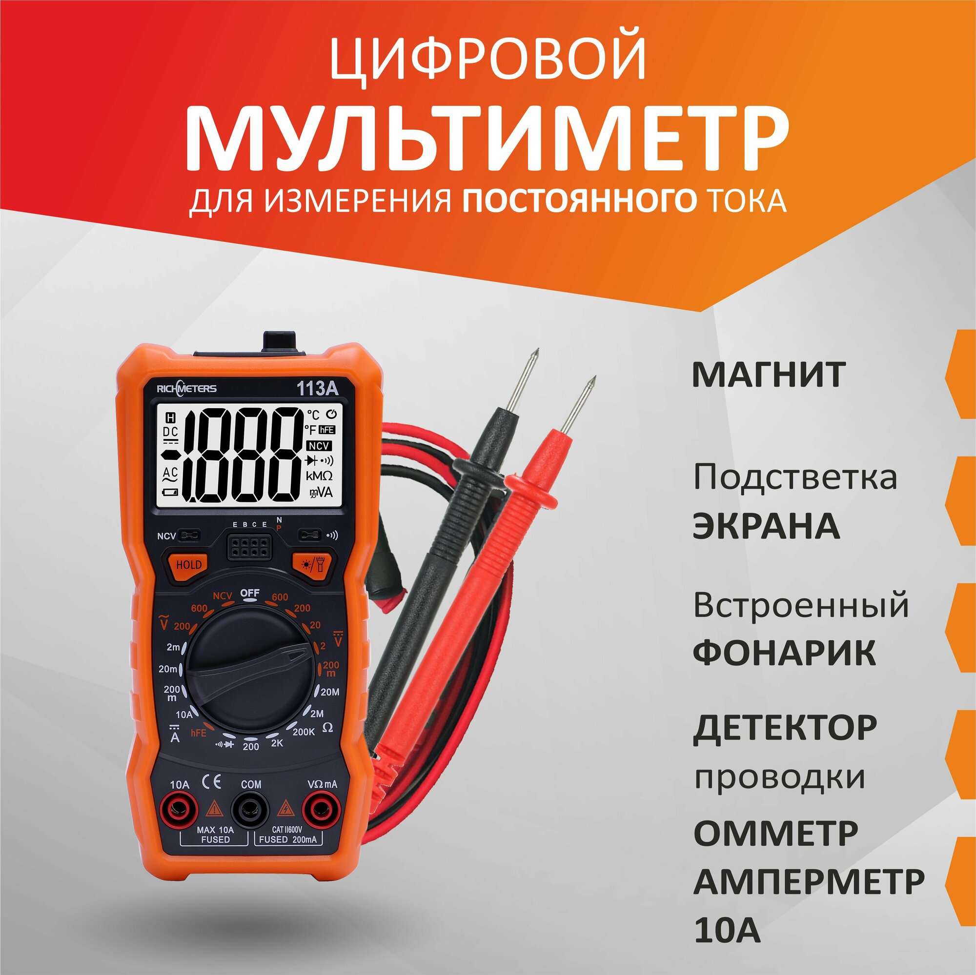 RichMeters – это цифровой мультиметр, прибор который необходим для домашней лаборатории или для использования в быту. Удобен в применении, надежный и неприхотливый в работе. У ЖК дисплея легкая и не раздражающие глаза, белая, светодиодная подсветка. В тестере есть светодиодный фонарик, мощный магнитный держатель для крепления прибора к металлическим основаниям, держатель щупов и силиконовый бампер. Питание прибора осуществляется от 3-х батареек ААА. Прибор оснащен большим числом режимов измерений. Звуковой режим прозвонки цепи. Режим измерения электронных компонентов: диодов, стабилитронов, варисторов, тиристоров, транзисторов и других полупроводниковых элементов. Тестер может определять коэффициент усиления транзисторов. У прибора есть режим: измерения сопротивлений, постоянного тока, а так же режимы измерения переменного и постоянного напряжения. Мультиметр оснащен датчиком скрытой проводки NCV - Non Contact Voltage, этот режим поможет определить проводку скрытую в стене или в других основаниях. МНОГОФУНКЦИОНАЛЬНОСТЬ Устройство применяется для измерений постоянного и переменного напряжения, сопротивления, постоянного тока. Есть режим прозвонки цепи на короткое замыкание, проверка диодов и N-P P-N переходов полупроводников, режим hFE для определения коэффициента усиления транзисторов, датчик скрытой проводки NCV - Non Contact Voltage. АВТОМАТИЧЕСКОЕ ОТКЛЮЧЕНИЕ Устройство поддерживает функцию автоматического отключения. Благодаря этому вы сможете более эффективно расходовать заряд батареи. УДОБСТВО ИСПОЛЬЗОВАНИЯ У данного мультиметра большой LCD Дисплей с легкой и не раздражающей глаза белой светодиодной подсветкой, мощный магнитный держатель для крепления прибора к металлическим основаниям, держатель щупов и силиконовый бампер, фонарик для использования в темноте.