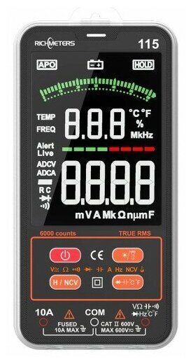 RichMeters – цифровой мультиметр с большим трёхстрочным высококонтрастным дисплеем, предназначен для измерения постоянного и переменного напряжения, постоянного и переменного тока, сопротивления, емкости конденсаторов и температуры. Имеется звуковая прозвонка соединения, функция True RMS, бесконтактное определение напряжения - NCV. Это портативный интеллектуальный мультиметр, который автоматически распознает режим работы и переключается на соответствующий диапазон измерений. Он также может вручную переключать режимы: прозвонка соединений, емкости конденсаторов, температуры. ПОЛНАЯ АВТОМАТИЗАЦИЯ Вам ничего не нужно переключать, интеллектуальный мультиметр автоматически распознает напряжение постоянное, напряжение переменное, сопротивление, звуковую прозвонку, частоту, переменный и постоянный ток и автоматически переключается на соответствующий диапазон измерений. Он также может вручную переключать режимы.AUTO.jpg VA LED ДИСПЛЕЙ У мультиметра большой трёхстрочный высококонтрастный EBTN дисплей, дающий возможность одновременного отображения ранзных параметров, а также наличие аналоговой графической шкалы. АВТОМАТИЧЕСКОЕ ОТКЛЮЧЕНИЕ Устройство поддерживает функцию автоматического отключения. Благодаря этому вы сможете более эффективно расходовать заряд батареи.