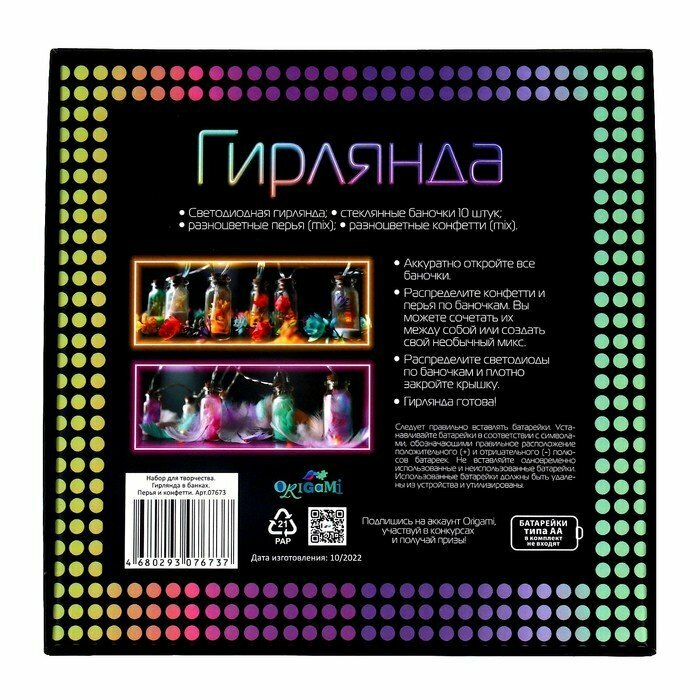 Комплектность: светодиодная гирлянда с отсеком для батареек, стеклянные баночки с пробковыми крышками (10 шт.), разноцветные конфетти из бумаги, разноцветные перья.