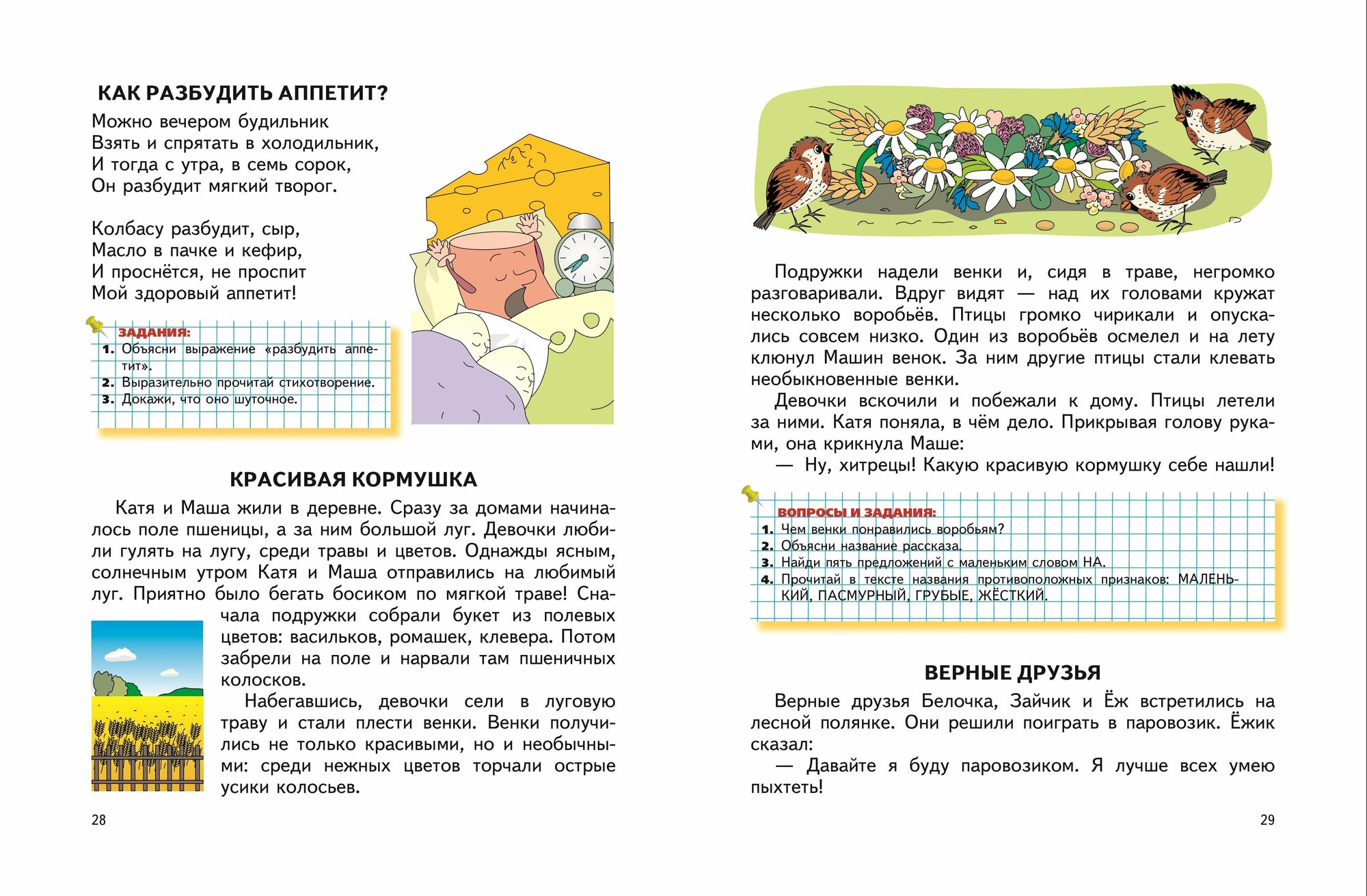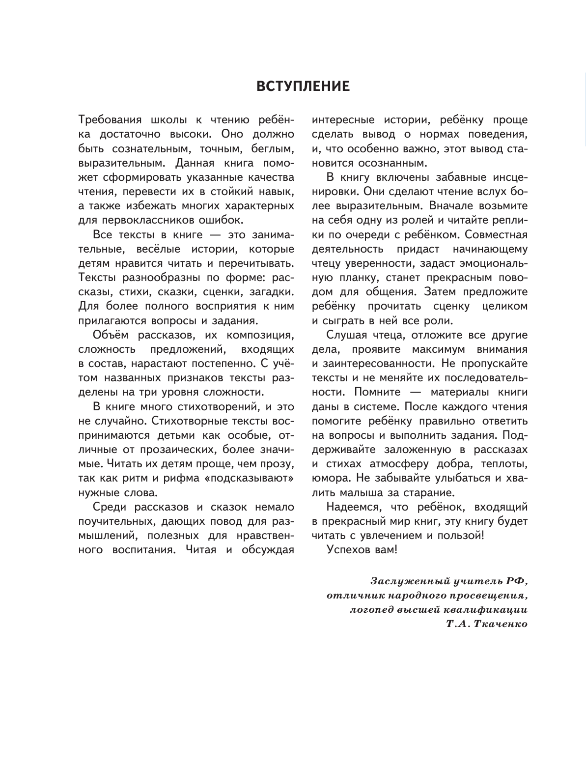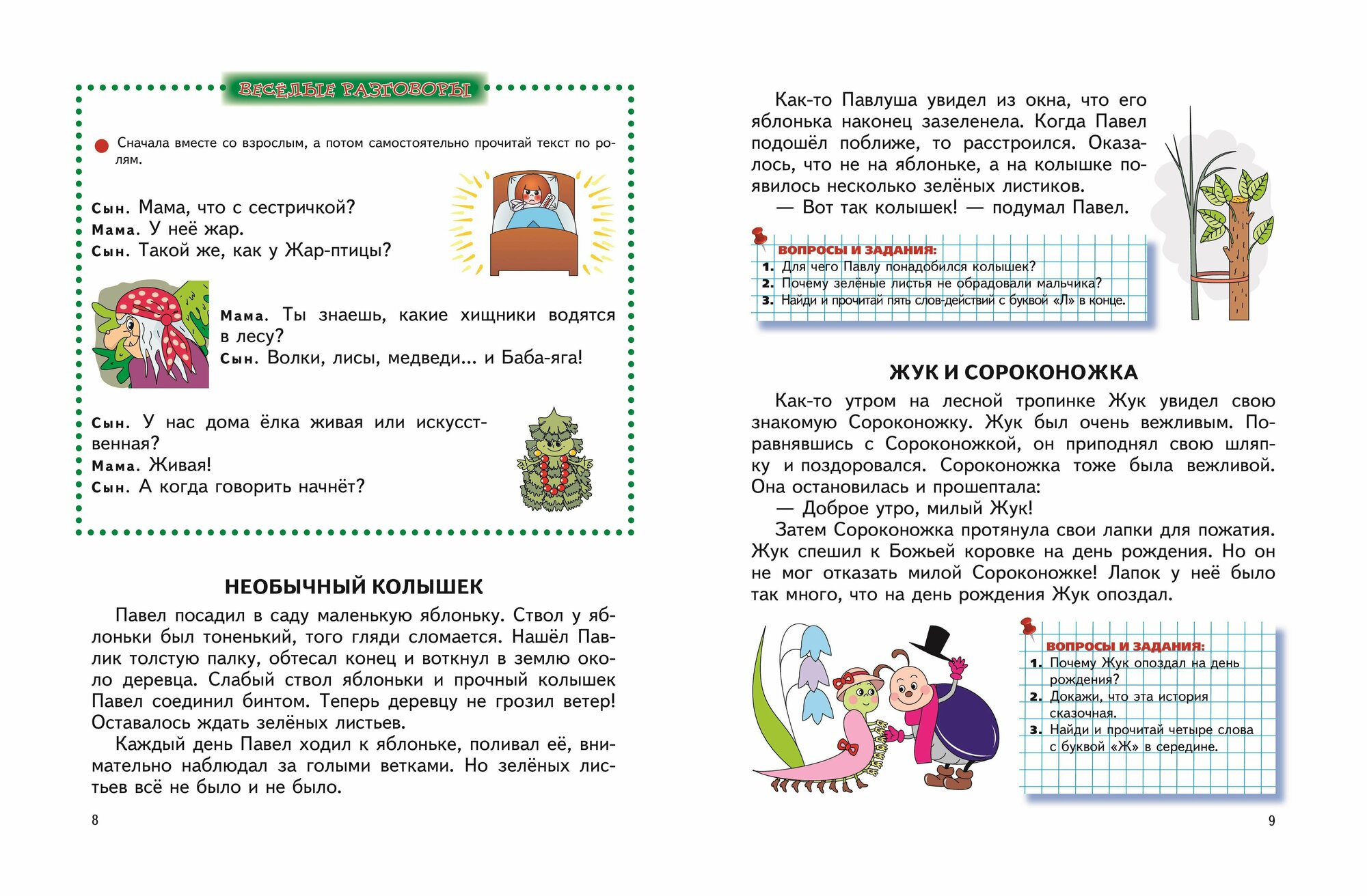 Незаменимым подспорьем для родителей и педагогов станут собранные в этой книге 90 текстов и 200 упражнений с иллюстрациями - ценные материалы, которые помогут развить у ребёнка интерес и любовь к чтению. В книге представлены короткие забавные и поучительные рассказы и сказки, выразительные стихи, весёлые сценки с вопросами и специальными заданиями для обсуждения. Все тексты составлены так, чтобы максимально улучшить самые важные качества чтения: беглость, сознательность, точность, выразительность. Благодаря системе занятий, изложенной в книге, у ребёнка повысится уровень связной речи, грамотности письма, внимания, разовьётся творческий потенциал. Рекомендуется для занятий в массовых и логопедических группах детских садов, а также для индивидуального обучения.