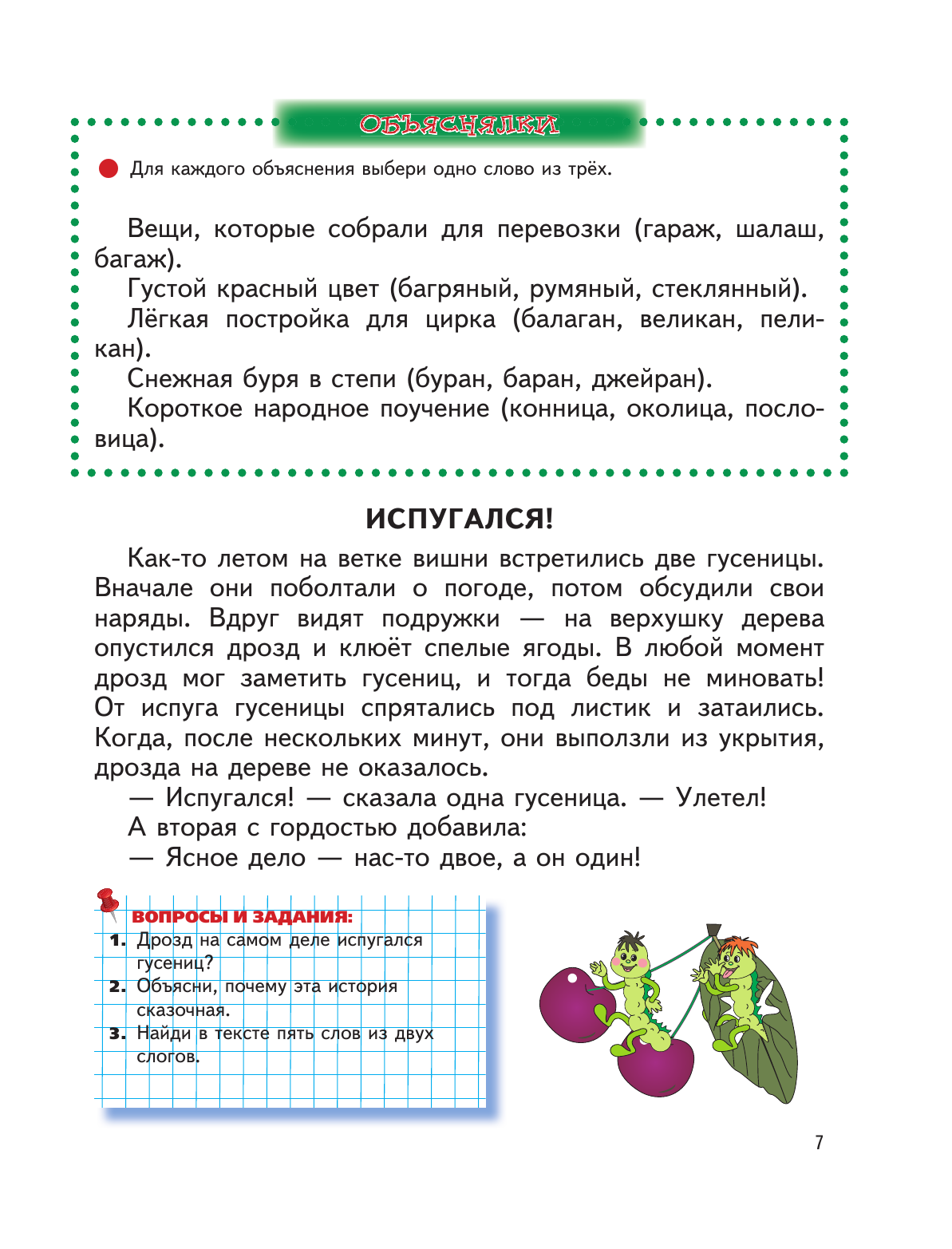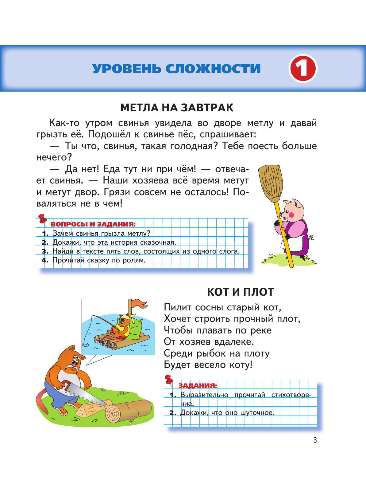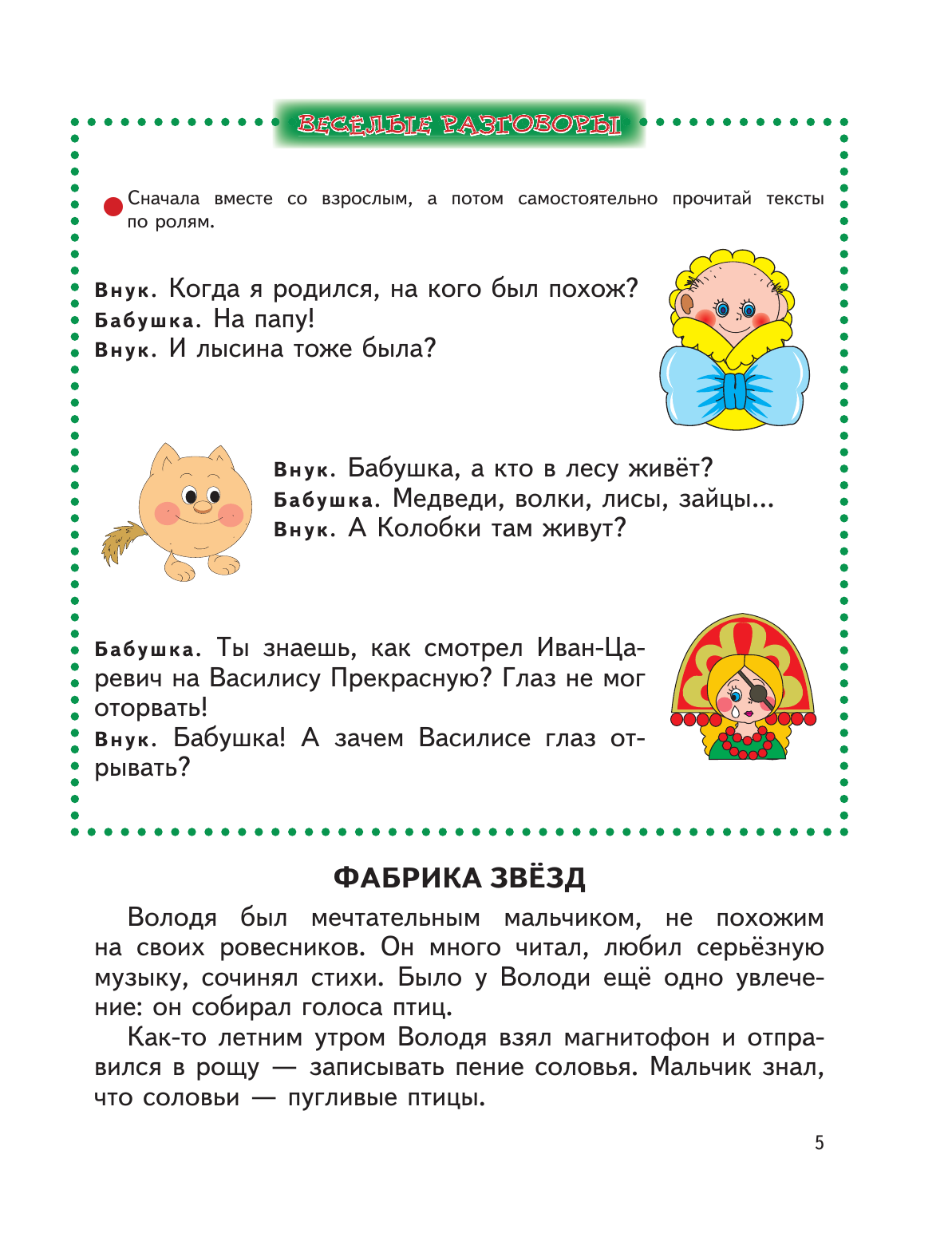 Незаменимым подспорьем для родителей и педагогов станут собранные в этой книге 90 текстов и 200 упражнений с иллюстрациями - ценные материалы, которые помогут развить у ребёнка интерес и любовь к чтению. В книге представлены короткие забавные и поучительные рассказы и сказки, выразительные стихи, весёлые сценки с вопросами и специальными заданиями для обсуждения. Все тексты составлены так, чтобы максимально улучшить самые важные качества чтения: беглость, сознательность, точность, выразительность. Благодаря системе занятий, изложенной в книге, у ребёнка повысится уровень связной речи, грамотности письма, внимания, разовьётся творческий потенциал. Рекомендуется для занятий в массовых и логопедических группах детских садов, а также для индивидуального обучения.