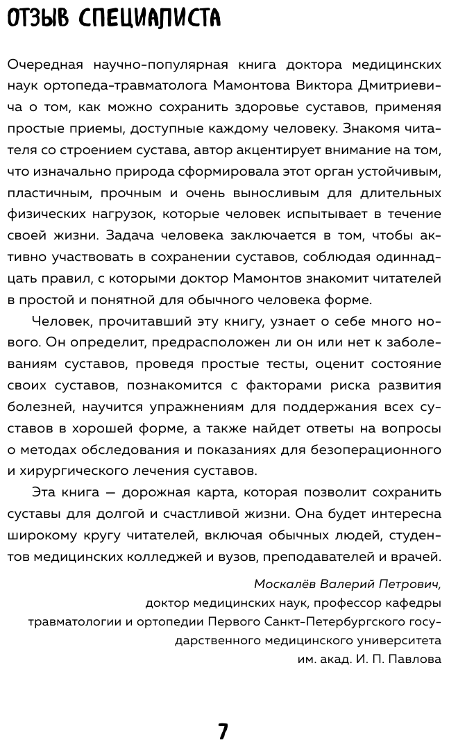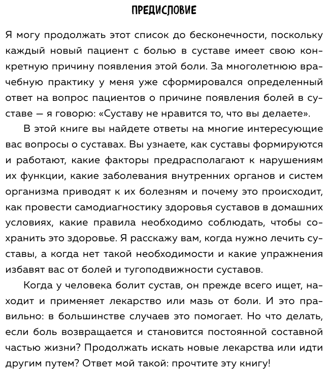 «Человек, прочитавший эту книгу, узнает о себе много нового. Он определит, предрасположен ли он или нет к заболеваниям суставов, проведя простые тесты, оценит состояние своих суставов, познакомится с факторами риска развития болезней, освоит упражнения для поддержания всех суставов в хорошем состоянии, а также найдет ответы на вопросы о методах обследования и показаниях для безоперационного и хирургического лечения суставов». — Москалёв В. П., доктор медицинских наук, профессор кафедры травматологии и ортопедии Первого Санкт-Петербургского государственного медицинского университета им. акад. И.П. Павлова
