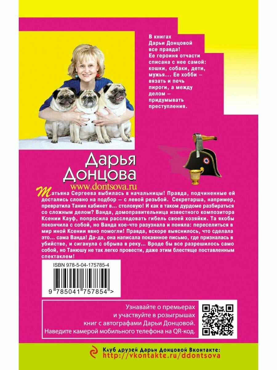 Татьяна Сергеева выбилась в начальницы! Правда, подчиненные ей достались словно на подбор - с левой резьбой. Секретарша, например, превратила Танин кабинет в… столовую! И как в таком дурдоме разбираться со сложным делом? Ванда, домоправительница известного композитора Ксении Кауф, попросила расследовать гибель своей хозяйки. Та якобы покончила с собой, но Ванда кое-что разузнала и поняла: переселиться в мир иной Ксении явно помогли! Правда, вскоре выяснилось, что сделала это… сама Ванда! Да-да, она написала покаянное письмо, где призналась в убийстве, и сиганула с обрыва в реку… Вроде бы все разрешилось само собой, но Танюшу не так легко провести, даже этим блестяще поставленным спектаклем!
