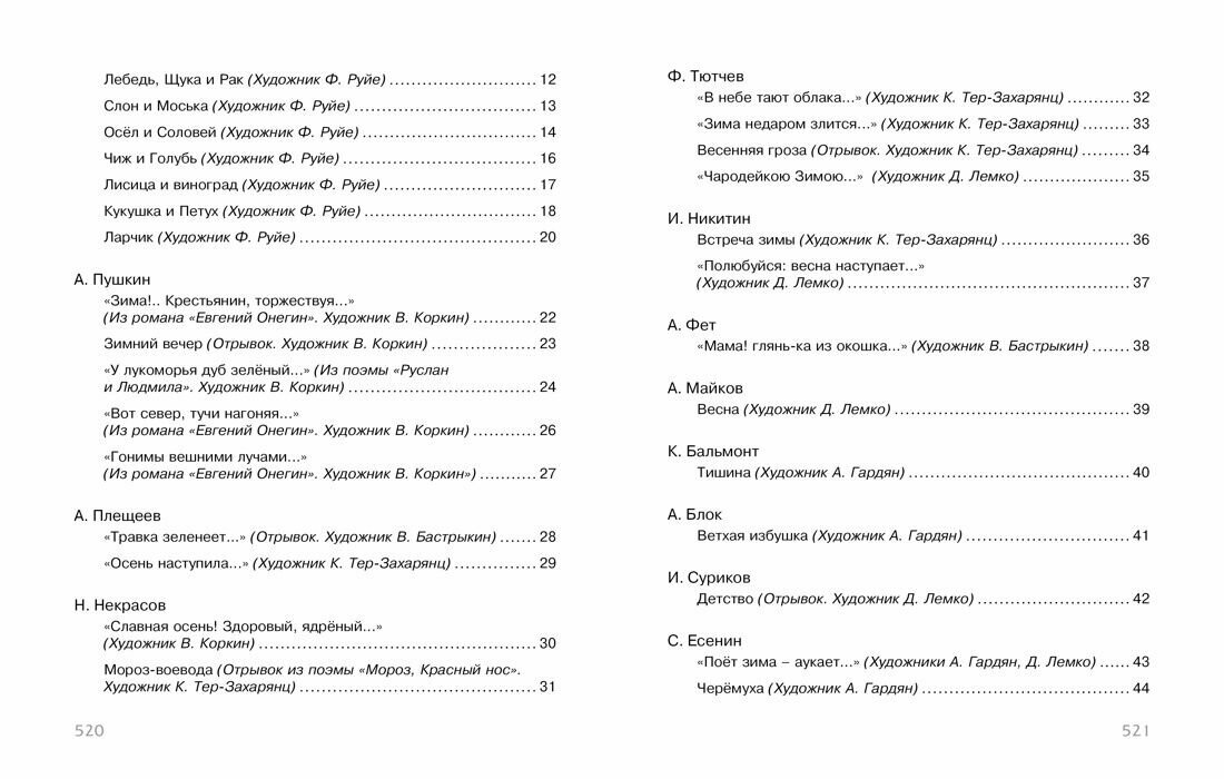 В этой хрестоматии наиболее полный охват авторов, чьи произведения составляют основу обучения детей в первых классах школы по программе и в качестве внеклассного чтения. В книге три раздела: в первом маленький школьник прочтёт басни Крылова, хрестоматийные стихи Пушкина, Некрасова, Тютчева, Есенина и других, в том числе современных, поэтов. В разделе сказок представлены самые известные русские народные сказки, а также сказки русских писателей. Последний раздел хрестоматии занимают рассказы классиков прошлых столетий. Произведения, вошедшие в хрестоматию, – это тот фундамент, на котором начинается формирование хорошего литературного вкуса у детей, развитие у них правильной речи и воспитание личности.