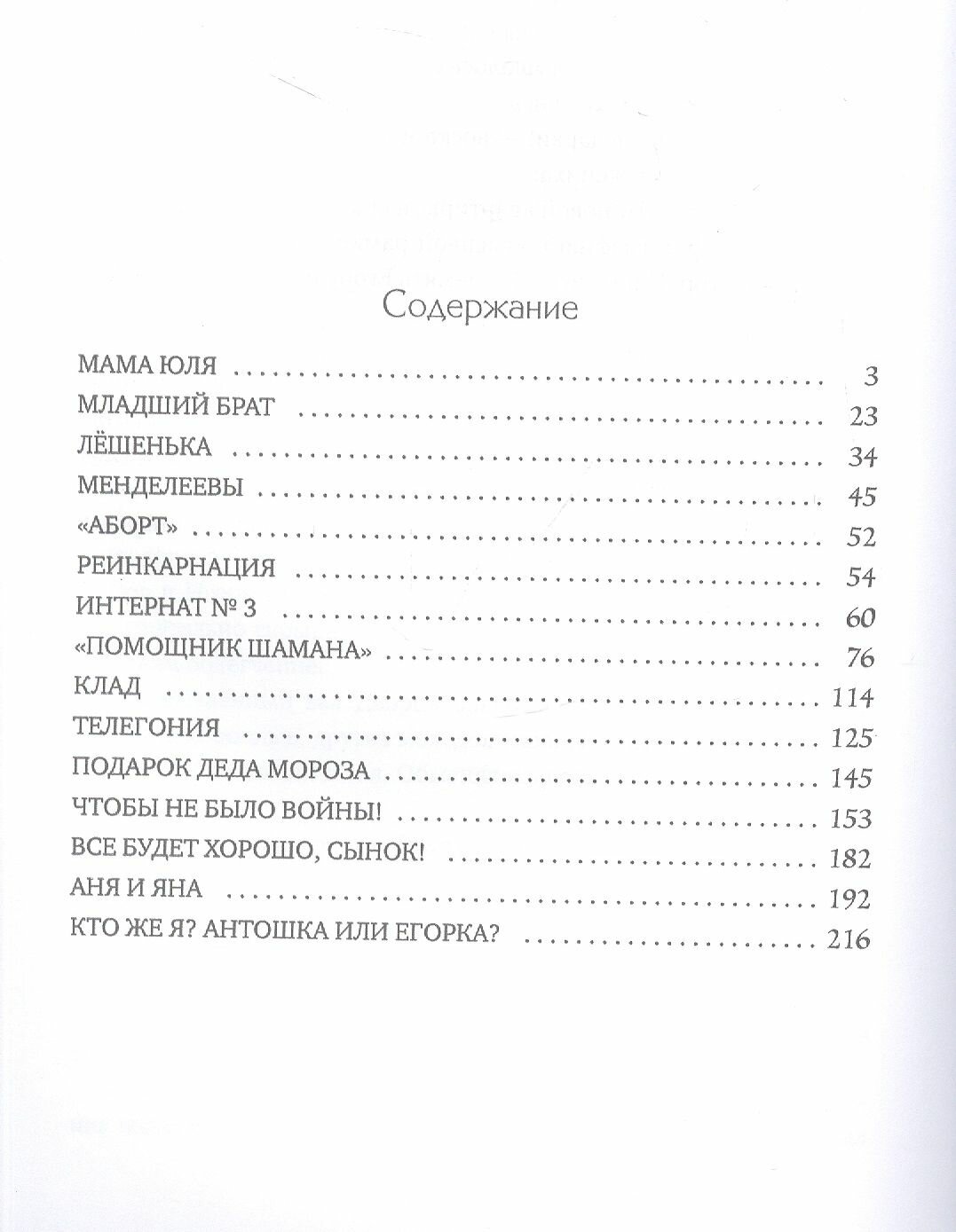 Очень интересная книга. Читается легко. Рассказы позитивные. Вызывают много эмоций. Заставляют задуматься. Особенно понравились рассказы " Лешенька", "Помощник шамана", "Мама Юля " действия рассказов происходит в наши дни. В рассказе"Мама Юля" рассказывается, как не легко стать настоящей матерью приемным детям. Как трудно и детям и взрослым стать одной дружной крепкой семьёй. Но все трудности преодолимы. Советую прочесть эту книгу.