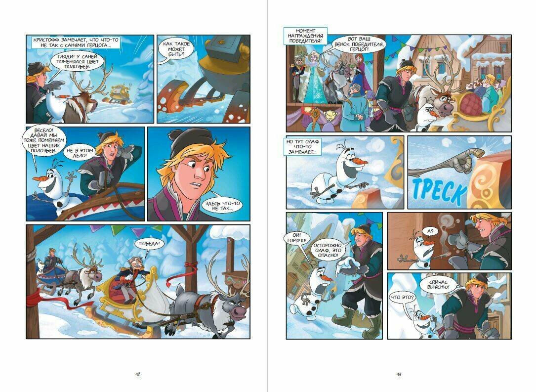 Встречай любимых героев — Анну, Эльзу, Олафа, Кристоффа и Свена — в новых захватывающих историях в формате комиксов! Друзей ждёт весёлая зимняя рыбалка, скоростные гонки на санях, страшилки у костра и море дружбы, игр, радости и веселья!
