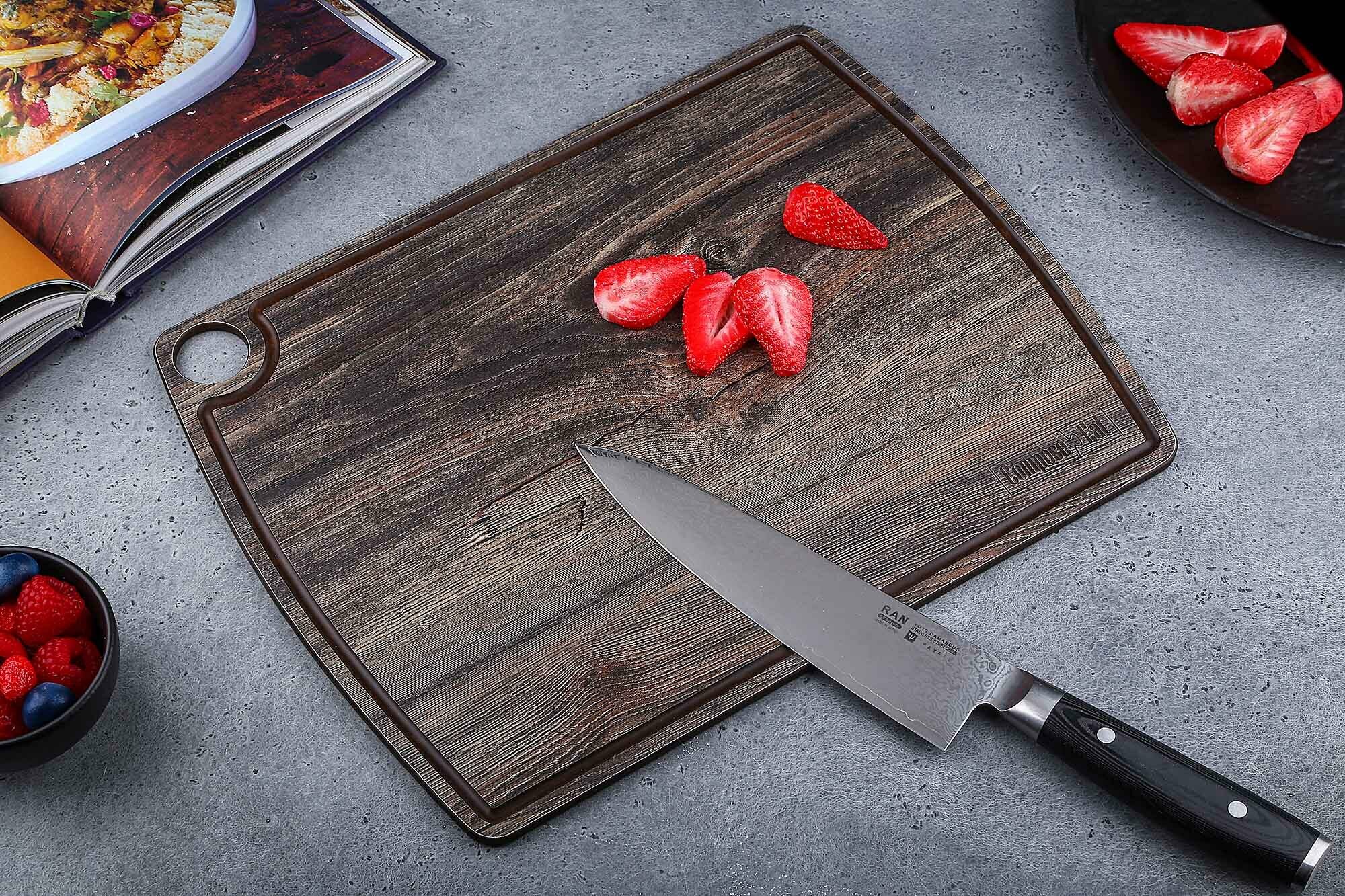 Разделочная доска выполнена из композитного материала на основе многослойной крафтовой бумаги. Это прочный, легкий, термостойкий материал, не подверженный деформации. Имеет защитное гипоаллергенное покрытие с антибактериальными свойствами. Безопасный и экологичный, соответствует требованиям Системы сертификации наноиндустрии. Рекомендован к использованию в быту, в медицинских и детских учреждениях. Преимущества разделочной доски: повышенная ударопрочность, не повреждает режущую кромку ножа, высокая термостойкость, не подвержена деформации и выцветанию, не впитывает запахи, антибактериальные свойства, пригодна для мытья в посудомоечной машине, специальное износостойкое покрытие.