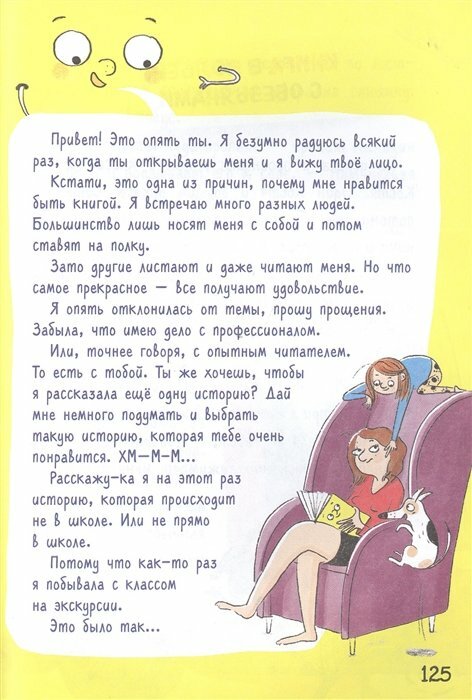 Такой формат подойдёт не всем, но в тоже время именно он заинтересует своей необычностью. В этой книге 5 коротких рассказов о приключениях книги: как она живёт в школьном классе, как ездила на экскурсию, итд.
