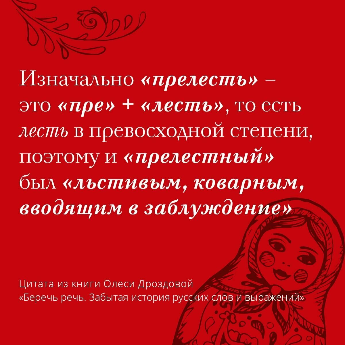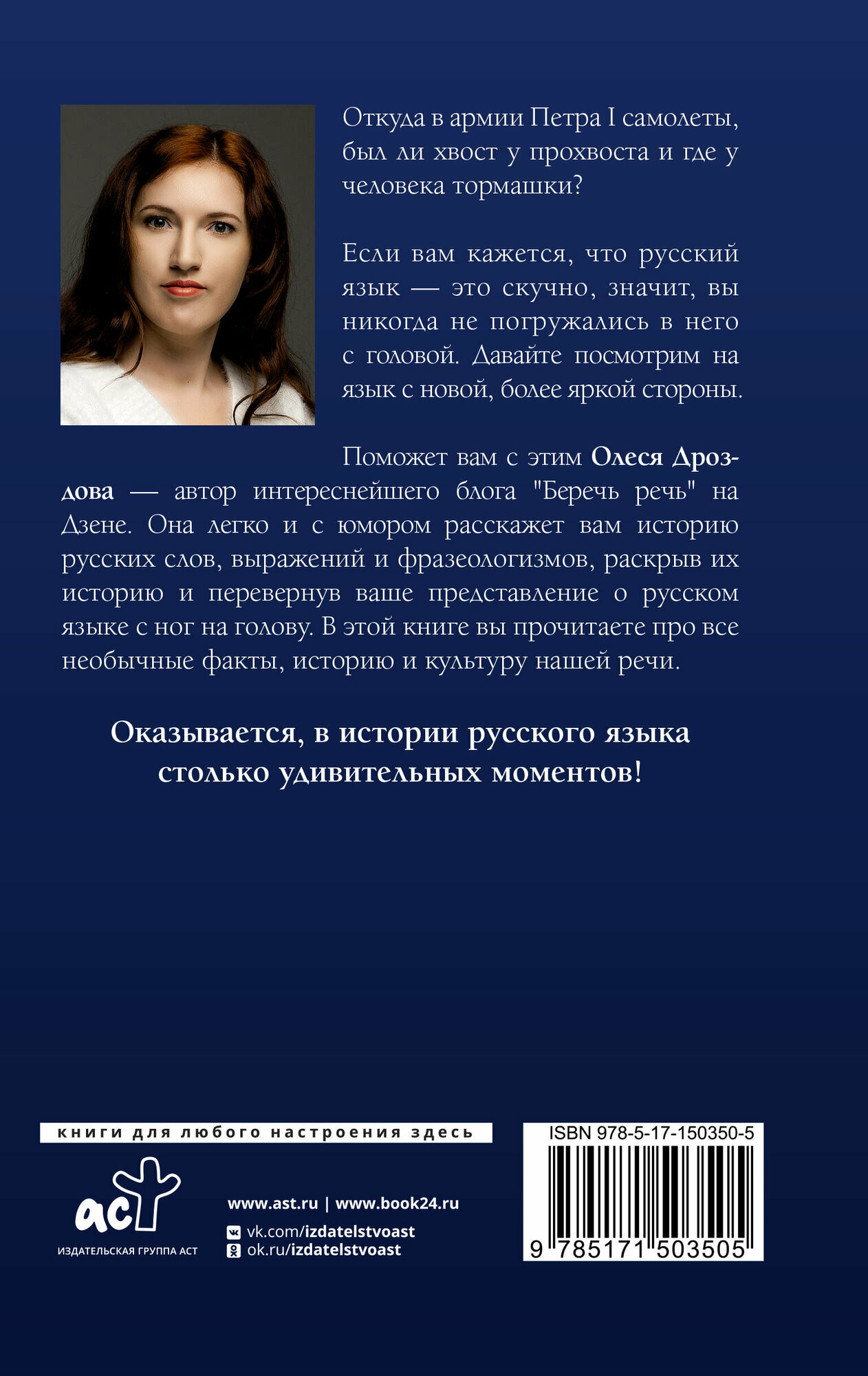 Олеся Дроздова - автор популярного канала "Беречь речь" на Дзене - легко и с юмором расскажет вам историю русских слов и выражений, раскрыв тайны происхождения множества фраз, которые мы используем при общении. Иллюстрированное издание, которое расскажет нам про необычные факты, историю и культуру нашей речи.