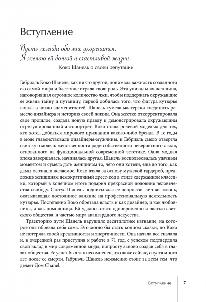 С ранних лет она окружала себя мифом и блестяще играла свою роль. Мастерски соединила историю своего тяжелого прошлого с репутацией дизайнера с мировым именем. Эта книга рассказывает о судьбе и наследии легенды моды, об эволюции и инновациях модного Дома на протяжении столетия. От первых шагов шляпного бизнеса и создания знаковых вещей, прославивших имя Шанель: маленького черного платья, твидового костюма и искусственного жемчуга до глобальной империи под руководством неподражаемого Карла Лагерфельда.