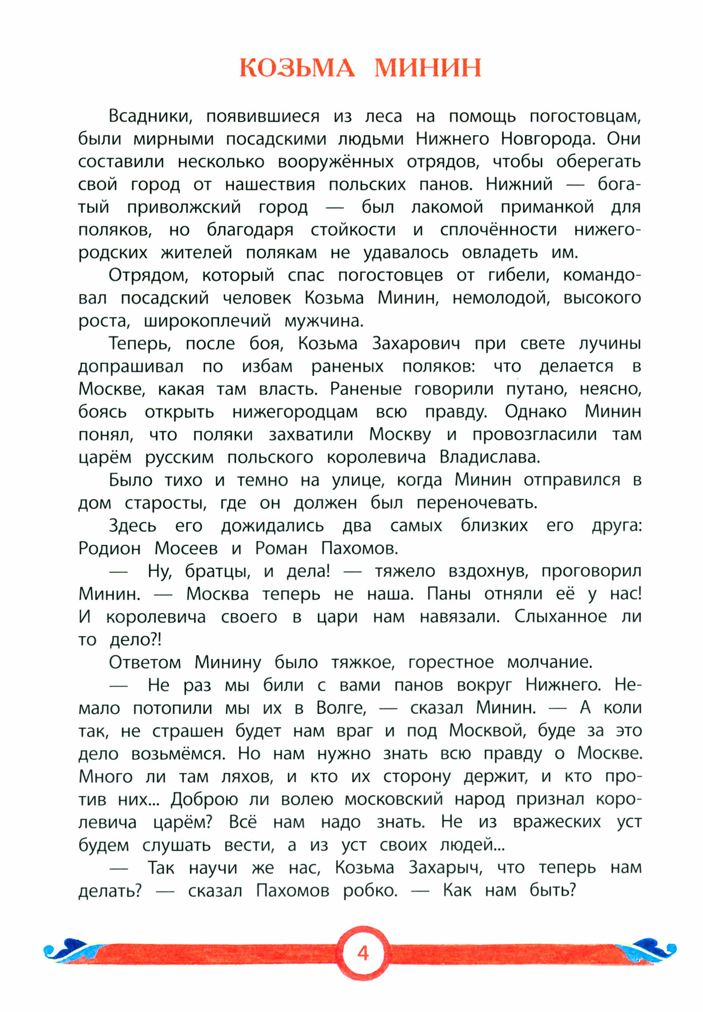 Рассказы о создании народного ополчения, возглавляемого нижегородским старостой Козьмой Мининым и князем Дмитрием Пожарским, которым благодарные потомки в 1812 году, к 200-летию окончания Смуты, воздвигли в Москве на Красной площади памятник. Благодаря их полководческому мастерству и личной храбрости, а также самоотверженности воинов-ополченцев в 1612 году Москва была освобождена от польских захватчиков.
