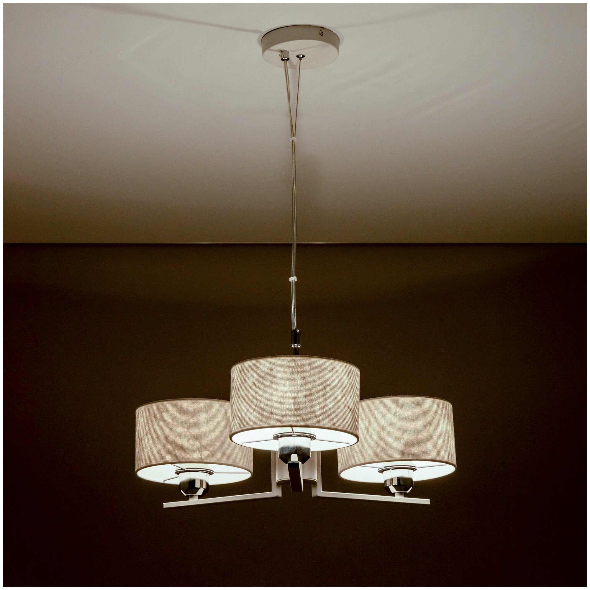 Аккуратная люстра, светлые абажуры, интересно смотрятся, когда включаешь свет.