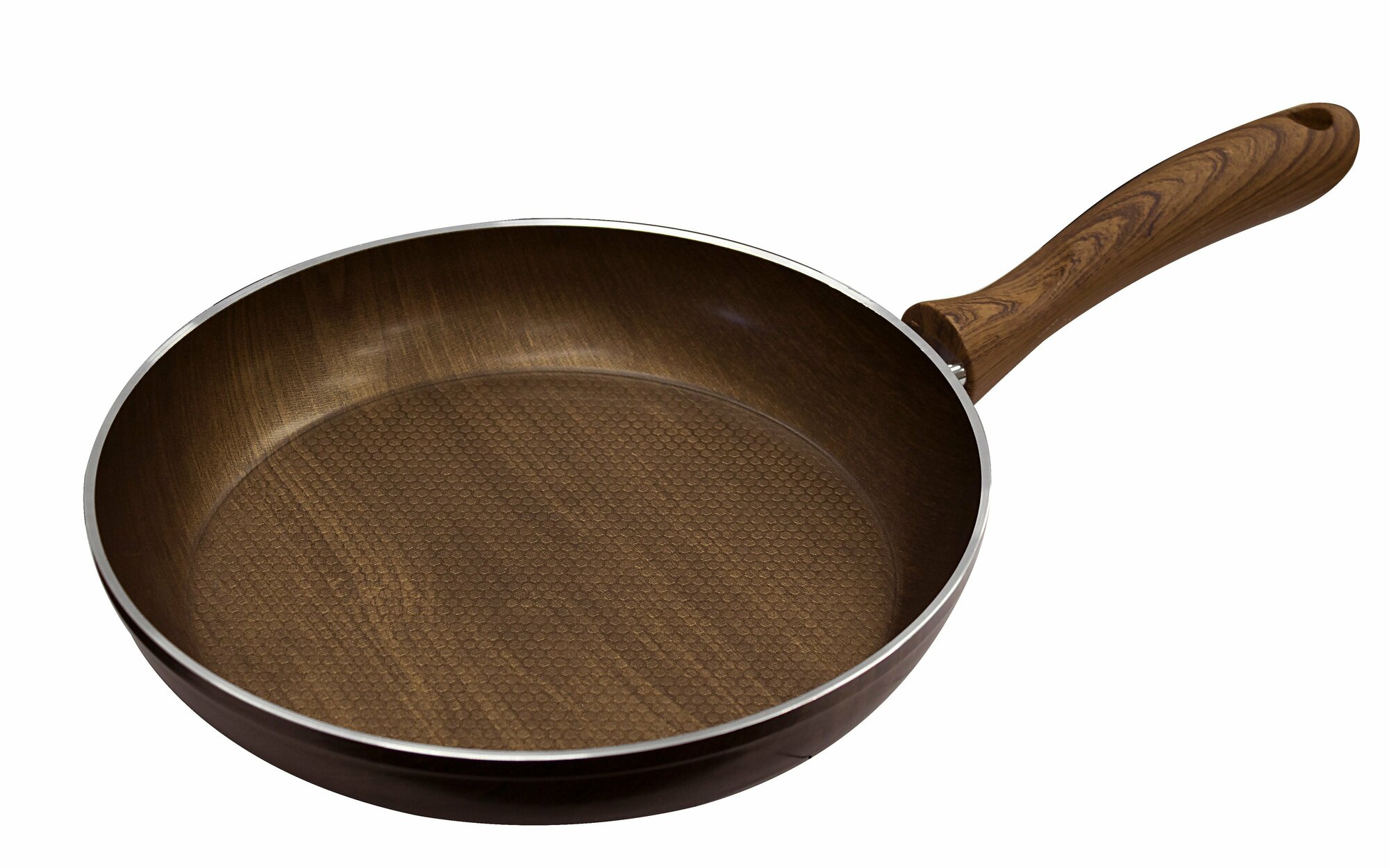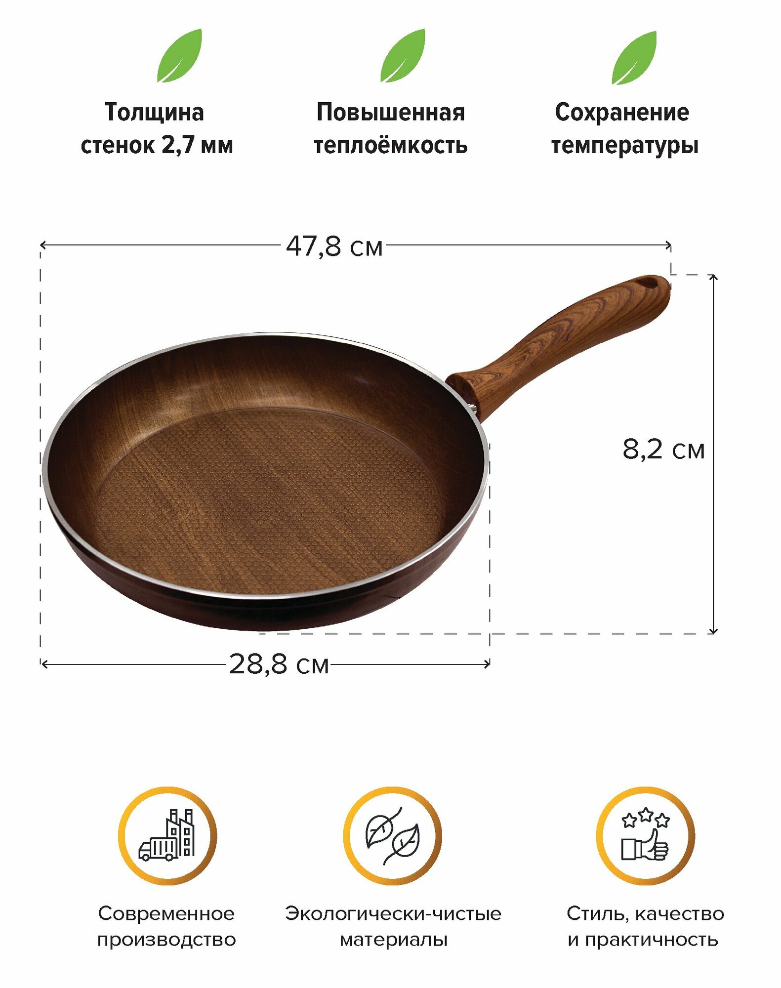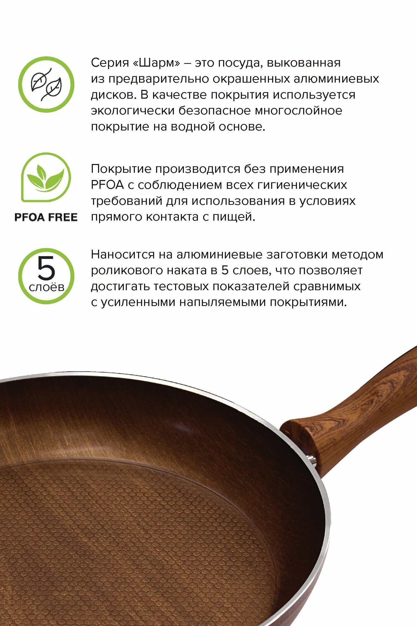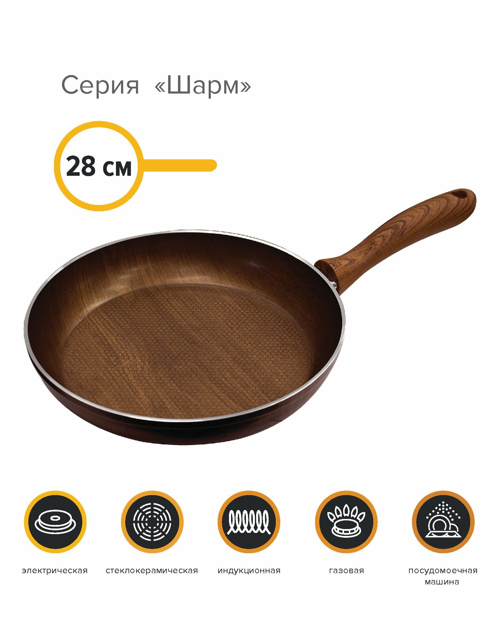 Серия "Шарм" ∎ это посуда, выкованная из предварительно окрашенных алюминиевых дисков. В качестве покрытия используется экологически безопасное многослойное покрытие на водной основе от итальянского производителя DEKO. Покрытие производится без применения PFOA с соблюдением всех гигиенических требований для использования в условиях прямого контакта с пищей, наносится на алюминиевые заготовки методом роликового наката в 5 слоев, что позволяет достигать тестовых показателей сравнимых с усиленными напыляемыми покрытиями. Цвет ∎ древесный. Внутренняя поверхность дна имеет неглубокий рельеф в виде сот. Ручка - бакелитовая, окрашена в тон корпуса, с эффектом деревянной поверхности, с покрытием Soft Touch. Толщина стенок - 2,7 мм, дна ∎ 4 мм. Дно ∎ индукционное. К данной сковороде подходит любая крышка диаметром 28см. Можно использовать на всех типах плит, мыть в ПММ.