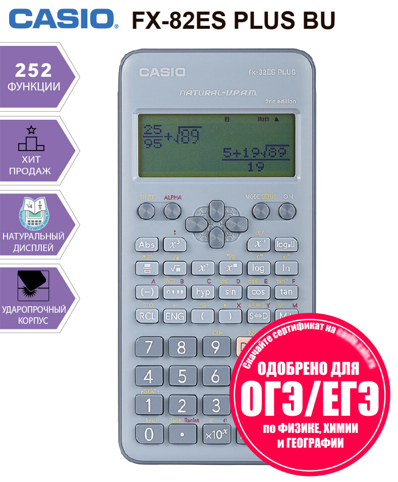 Инженерный калькулятор с естественным вводомвыводом данных Casio . Разработанная Casio система естественного вводавывода математических выражений Natural Display (Natural-V.P.A.M.) обеспечивает вывод на дисплей обыкновенных дробей, экспонент, логарифмов, степеней и корней в виде, принятом для записи в учебниках. В результате уменьшается количество вычислительных ошибок и сокращается время вычислений. Данная модель имеет сертификат ЕГЭ по физике и химии.