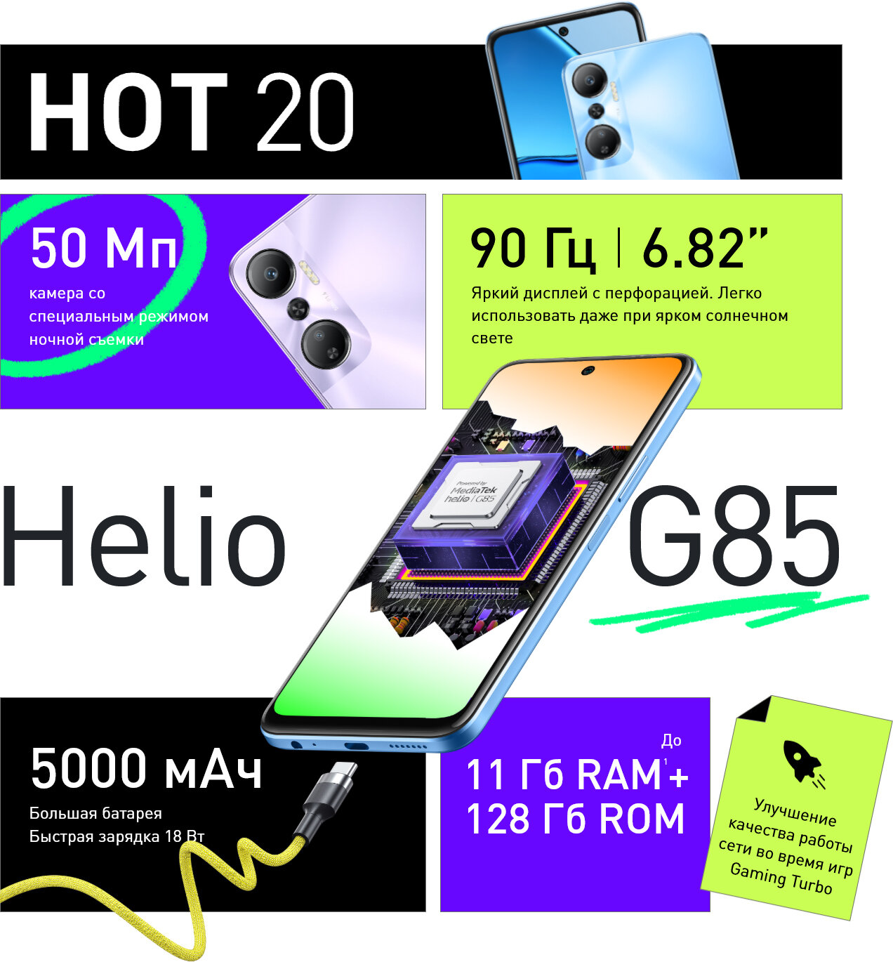 Смартфон Infinix Hot 20 - это инновационный глобальный смартфон, который обеспечит вам высокую производительность и продвинутые функции.