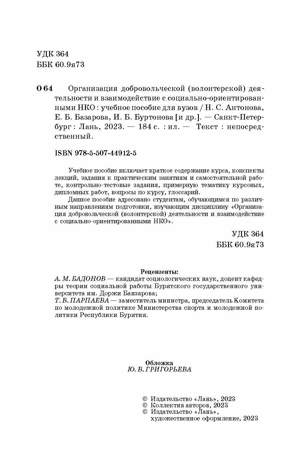 Организация добровольческой (волонтерской) деятельности и взаимодействие с социально-ориентированным (Антонова Надежда Сергеевна, Базарова Екатерина Борисовна, Буртонова Ирина Бабасановна); Лань, 2023