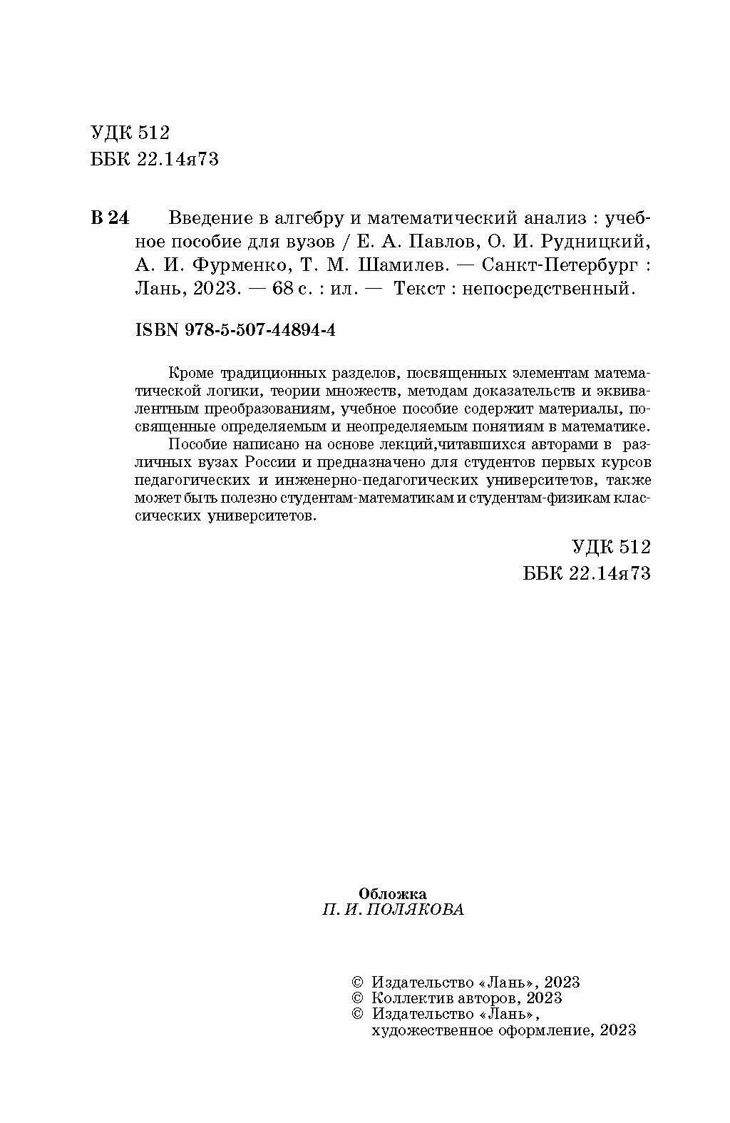 Введение в алгебру и математический анализ. Учебное пособие (Павлов Евгений Александрович, Рудницкий Олег Иванович, Фурменко Александр Иванович); Лань, 2023