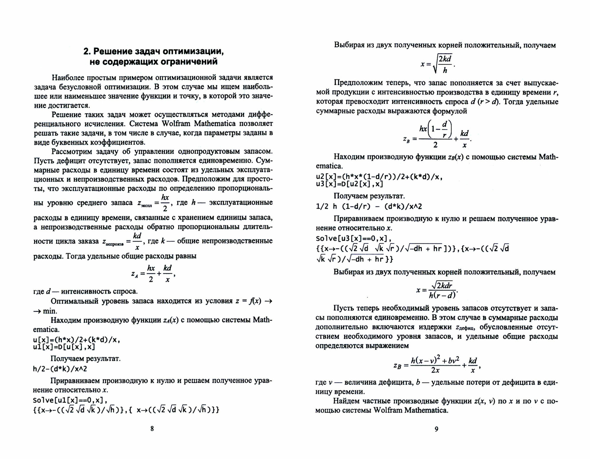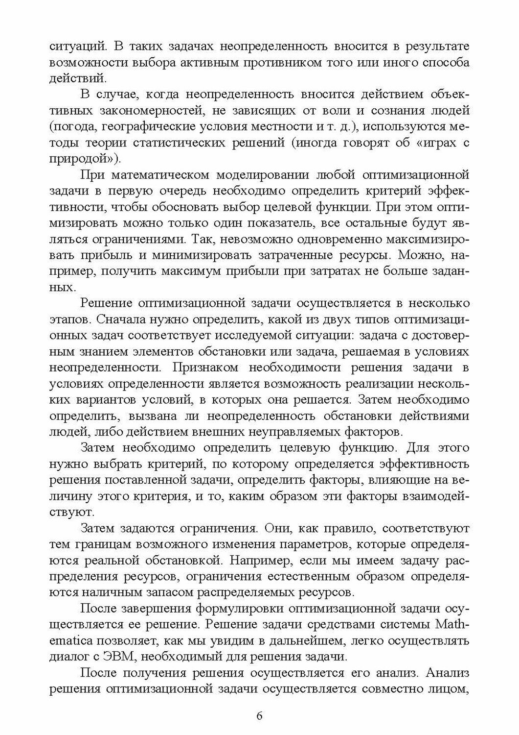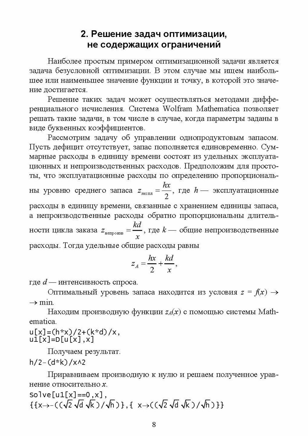 Пособие посвящено решению различных задач оптимизации: линейного и нелинейного программирования, безусловной оптимизации и др. Рассмотрено большое количество задач и примеров. Изложение ведется с использованием системы Wolfram Mathematica. Все примеры сопровождаются описанием решения с использованием данной системы.