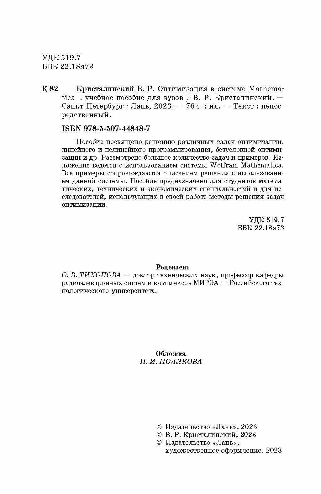 Оптимизация в системе Mathematica. Учебное пособие (Кристалинский Владимир Романович); Лань, 2023