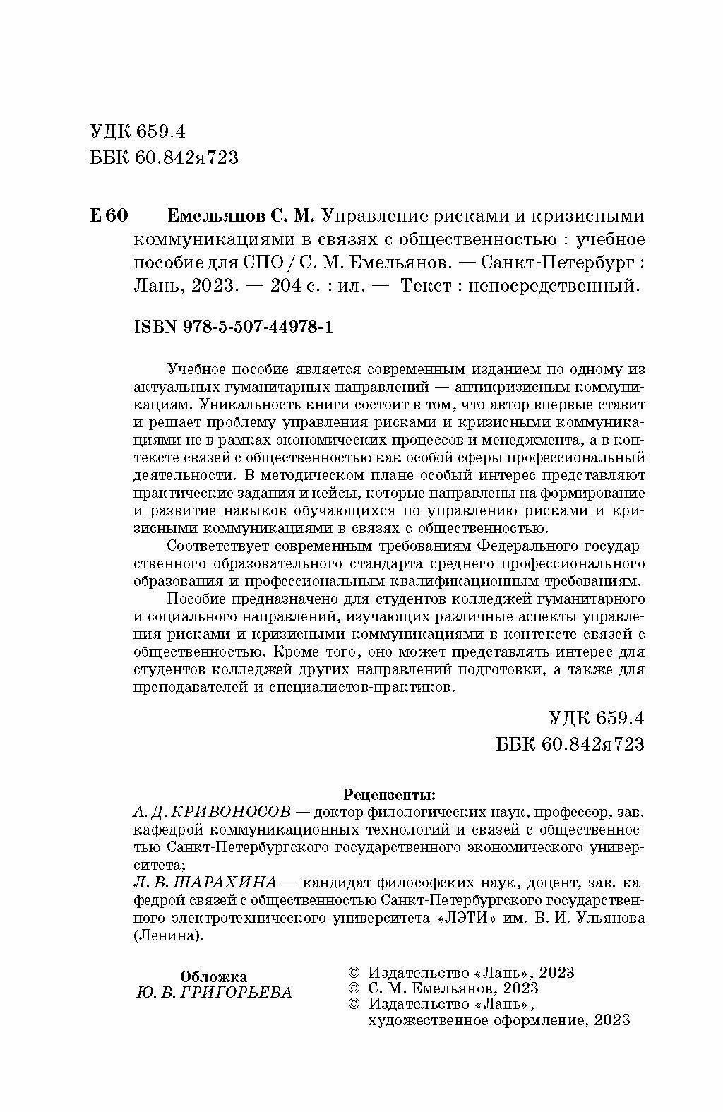 Управление рисками и кризисными коммуникациями в связях с общественностью (Емельянов Станислав Михайлович); Лань, 2023