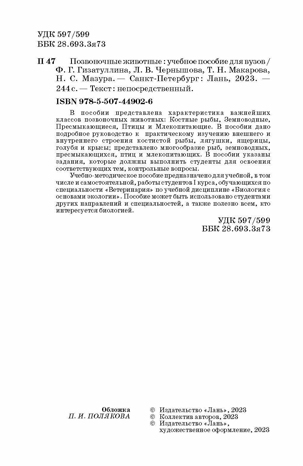 Позвоночные животные. Учебное пособие (Макарова Татьяна Николаевна, Гизатуллина Фирдаус Габдрахмановна, Чернышова Лариса Владимировна); Лань, 2023