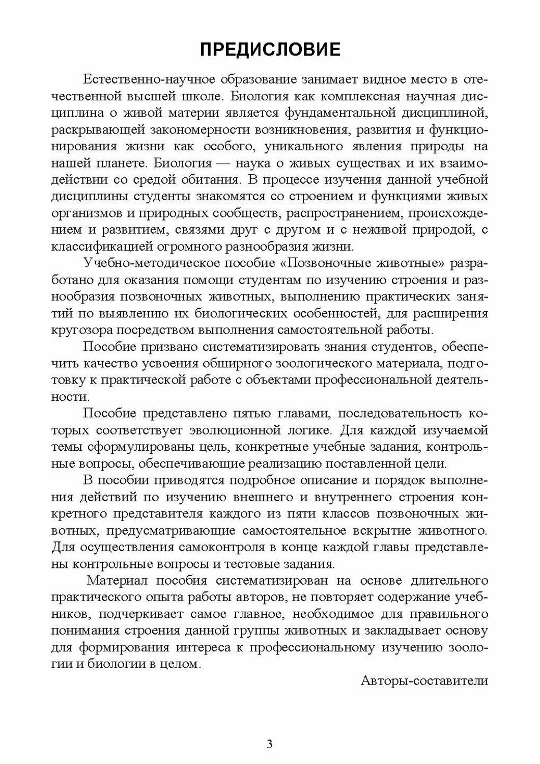 В пособии представлена характеристика важнейших классов позвоночных животных: Костные рыбы, Земноводные, Пресмыкающиеся, Птицы и Млекопитающие. В пособии дано подробное руководство к практическому изучению внешнего и внутреннего строения костистой рыбы, лягушки, ящерицы, голубя и крысы; представлено многообразие рыб, земноводных, пресмыкающихся, птиц и млекопитающих. В пособии указаны задания, которые должны выполнить студенты для освоения соответствующих тем, контрольные вопросы.