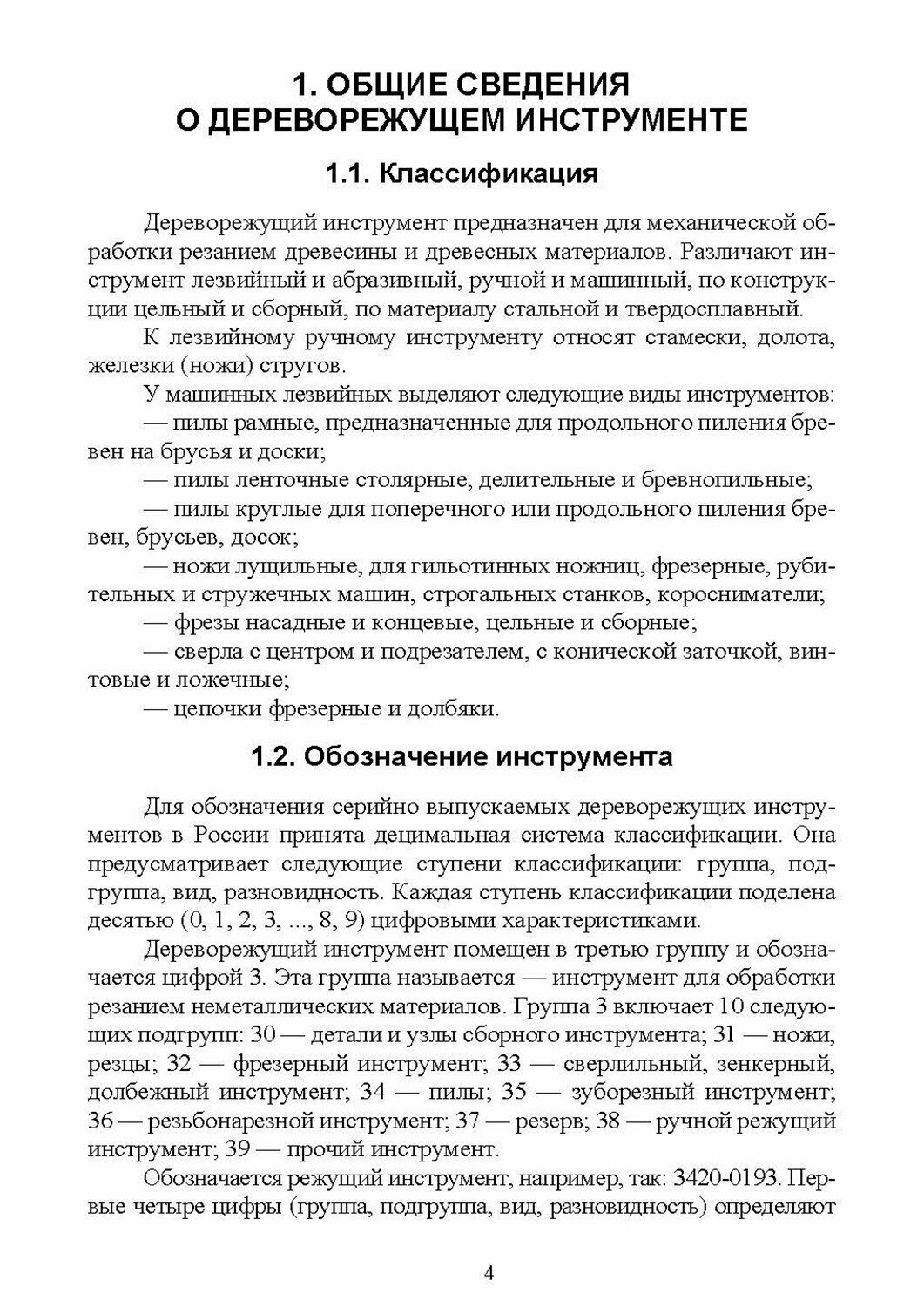 Книга состоит из десяти глав. В первой главе учебного пособия даны подробные сведения о дереворежущем инструменте: стальном лезвийном и абразивном заточном инструменте. Вторая глава посвящена чистке стального инструмента от налипшей древесной смолы, грязи. Показано применяемое оборудование для этих целей. В третьей главе рассмотрены рамные пилы, конструкция, подготовка их к работе, заточка пил. В остальных главах рассмотрены соответственно подготовка к работе ленточных пил, круглых пил, короснимателей, ножей, ножевых валов и фрез, сверл, режущих цепочек. В десятой главе рассмотрены общие принципы заточки твердосплавного режущего инструмента на станках с ЧПУ.
